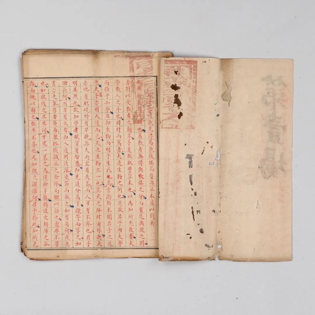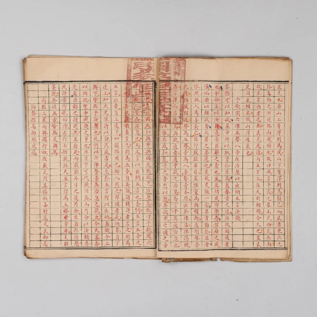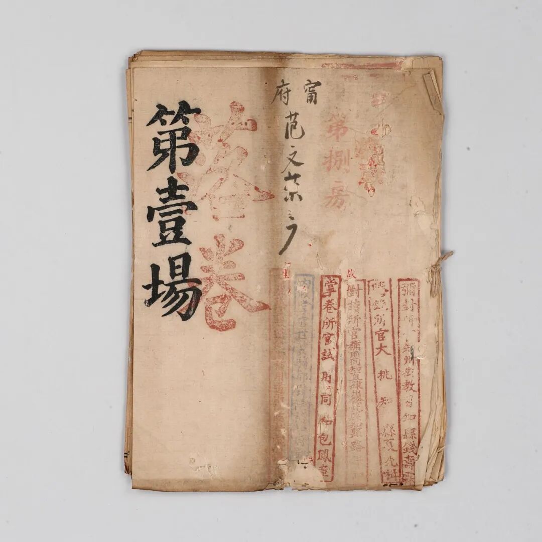 此即为清光绪间宁波府范文荣乡试三场朱卷,通篇朱笔誊录于墨色栏格内,纸捻装。上押“落卷”红印,下附“弥封所官知州衔教习知县钱嘉霖”、“誊録所官大挑知县夏先楫”、“掌卷所馆候补同知郭之桢”等人朱印。是为清代浙江地区科举制度之实物参考。