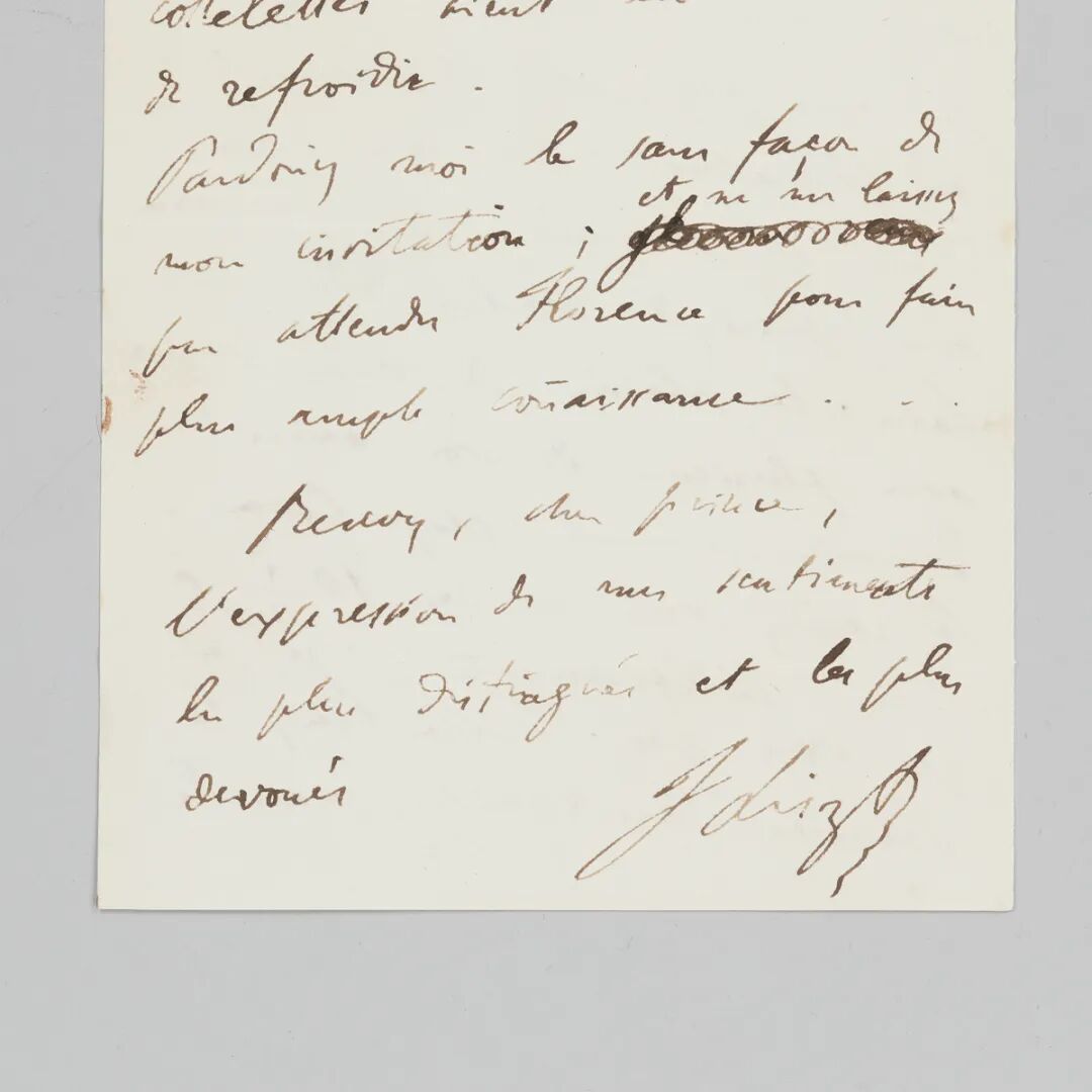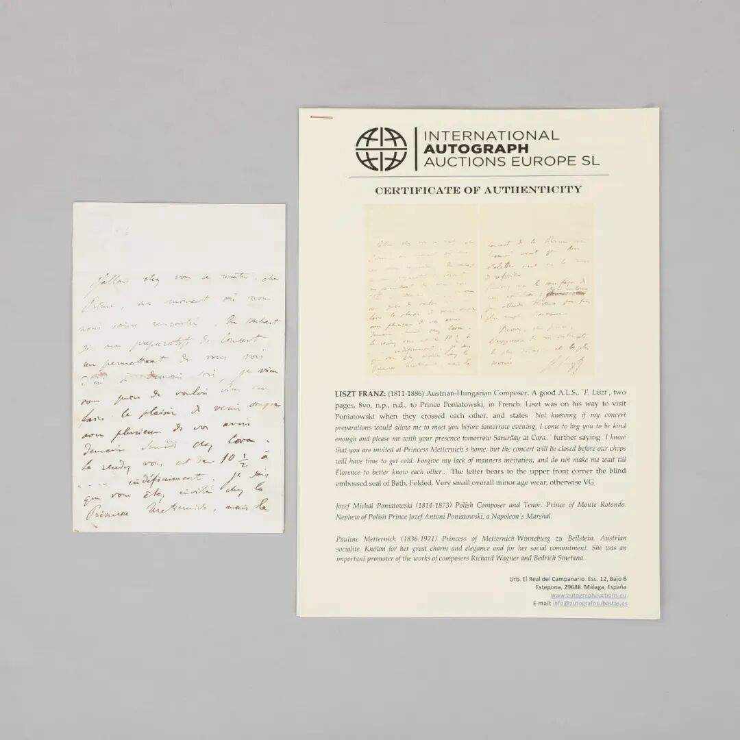 此为李斯特致波兰王子波尼亚托夫斯基亲笔信,围绕李斯特音乐会而作。信中李斯特邀请王子参加周六晚上的音乐会,并提到了社交名流梅特涅公主(Pauline Metternich)。