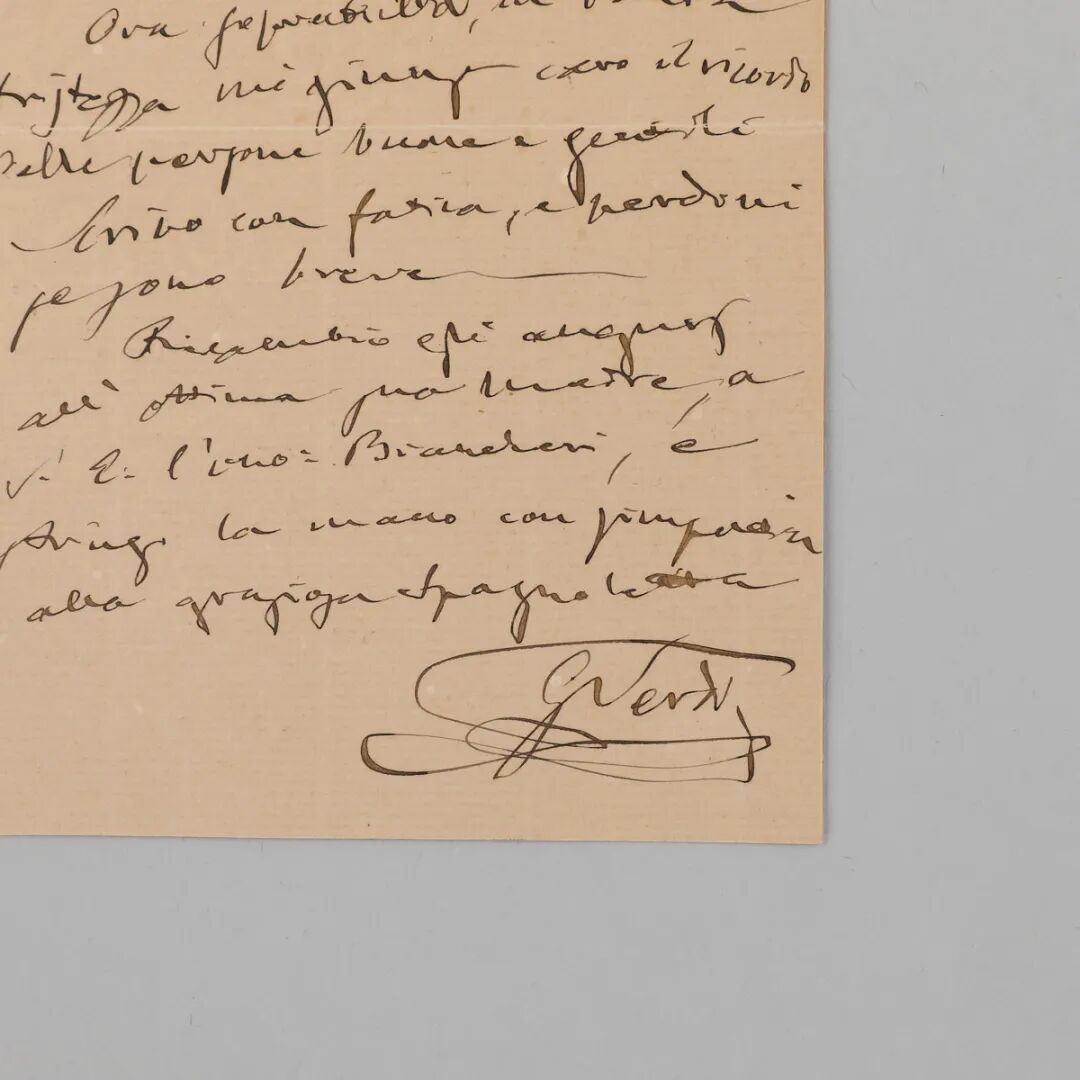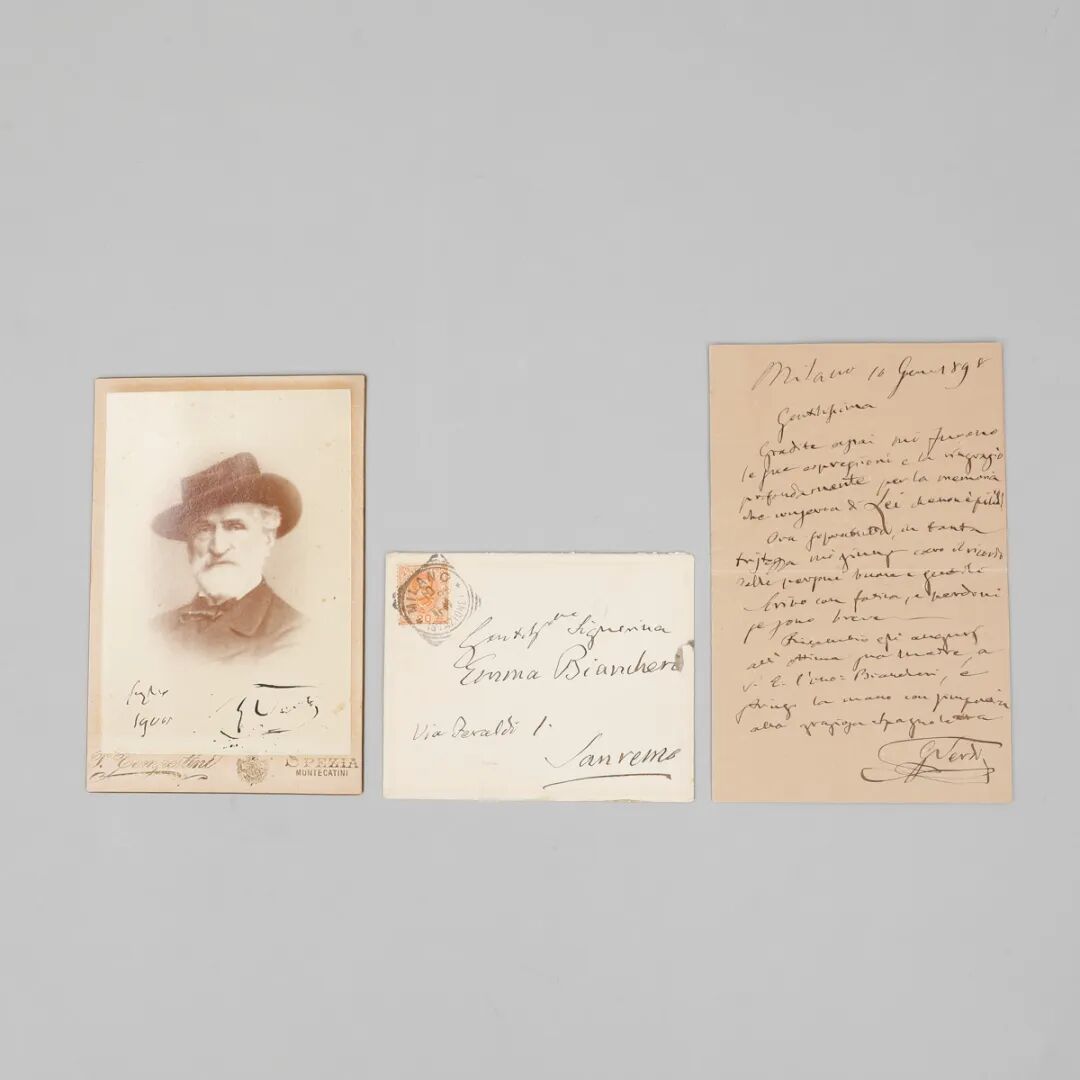 说明:此为威尔第亲笔信及签名照二种,其中,信件谈到一位女士,或是为悼念她而作。信中,威尔第写道:“……我深刻感谢您还记得她,我对她仍保有更多的记忆。现在卡洛非常难过,想起了他的慷慨,我在这里为他祈祷……”
