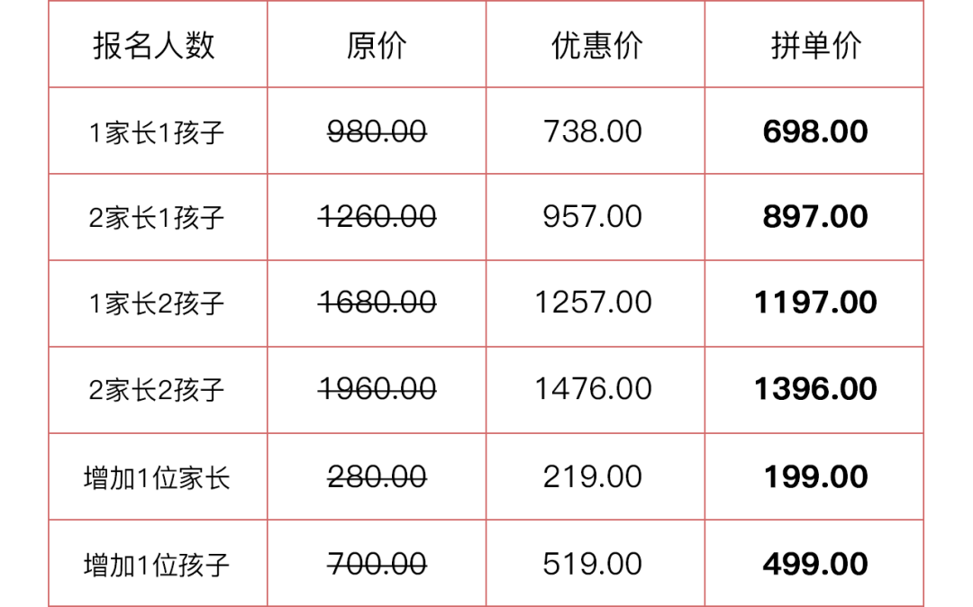 (为保证课程质量,每组限10个亲子家庭,先报先得。ps:同行拼团可享超值优惠价!)