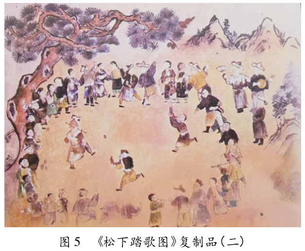 其三,文化再生产的重要图例。《松下踏歌图》是各民族在文化互通或交流过程中熔铸共生的审美符号。随着文化传播媒介与传播方式的发展,《松下踏歌图》经历多重机制的审美变形生产出不同形态的复制品。通过复制生产,多民族交往交流交融的信码获得了多元化的表达,情感认同、文化认同、民族认同得到了艺术维度的建构,意味着艺术形象的文化再生产。