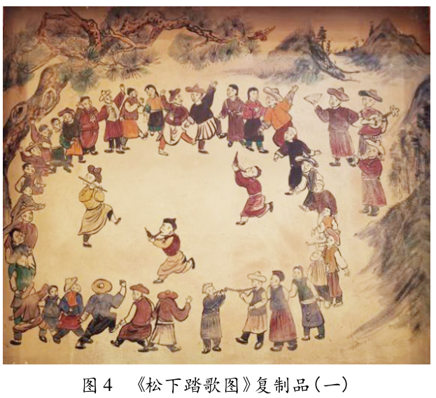 其二,族际修睦的维系方式。彝族、汉族、白族、苗族、傈僳族等基于生存和生活的需要而相互交往,融汇不同民族的传统文化、风俗习惯,产生和传承丰富多彩的民族民间文艺。多民族的交往历史与修睦理念成为《松下踏歌图》及其复制品产生及传播的内在原因。