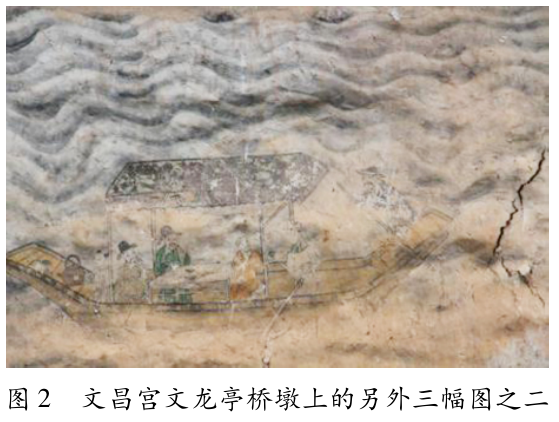 另外3幅图像都与水有关。如图1所示,在《松下踏歌图》对面的桥墩上,以水开始,有一装饰精美的船临近岸边,一名女子坐在船中的椅子上,后有一名站态书童扶椅持扇,一名绿衣书童蹲坐划船,船后摆有杯具和茶壶。女子手持花枝看向岸边,岸上可见8名男性(下端人物已经模糊),穿明代款式的右衽长服,手持一黄色卷曲状物件(似香包)(),扔向女子,而船头亦有8件该物品。图2位于图1的左侧,群山下的水中有一艘大船,内有6人(从左向右):船头持扇的书童,手持杯具的两名穿明朝官服的男性,桌子对面一名和尚,一戴草帽的划船女子,船尾处撑船的老汉。图3位于《松下踏歌图》桥墩右侧,已经非常模糊,依稀可见两名穿明朝服饰的男子注目向右,一船在湍急的水流中,船上有两名女子,一人双手舞剑,一人佩双剑划船。图1与图2,图3与《松下踏歌图》之间靠一段连绵的山景连接;图2与图3,图1与《松下踏歌图》之间隔着入文龙亭的小桥,桥墩两侧分别绘有两幅出水龙图。