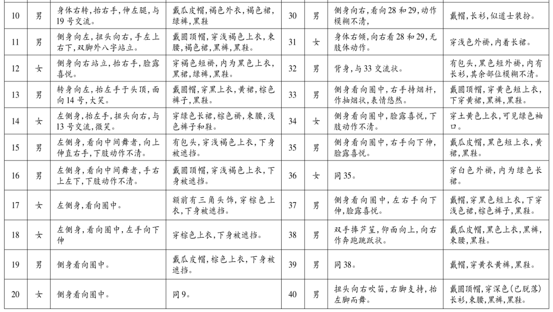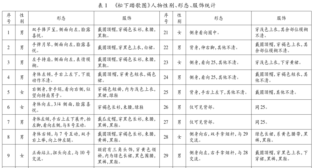 《松下踏歌图》惟妙惟肖地展现以彝族为主的打歌场景,《巍宝山志》载:“图中所画的打歌者绝大多数就是当地的彝族群众,一部分半彝半汉的打扮者,很可能是外出做过事或在外地做事回家探亲的彝族人。”要辨别其中的族属,图像学研究能够比较真实地反映社会实景与地域民族文化。图像学把绘画作品视为“第一手材料”,分析图像的描绘内容,揭示图像在各个文化中形成、变化及表现、暗示出来的思想观念。为此,笔者从图像人物的形态、服饰及叙事场景角度(表1),对人物形象进行识别,找到其中的差异性和共同性,从图像里面发现族属信息,完成该图的情节性、民族性解读。