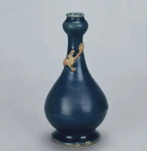 祭蓝釉是蓝色高温釉瓷,创烧于元代,因成品常被用来做庙堂上的祭器而得名。这件祭蓝釉堆塑蟠螭纹蒜头瓶因器口似蒜头、颈肩部堆塑蟠螭而得名。