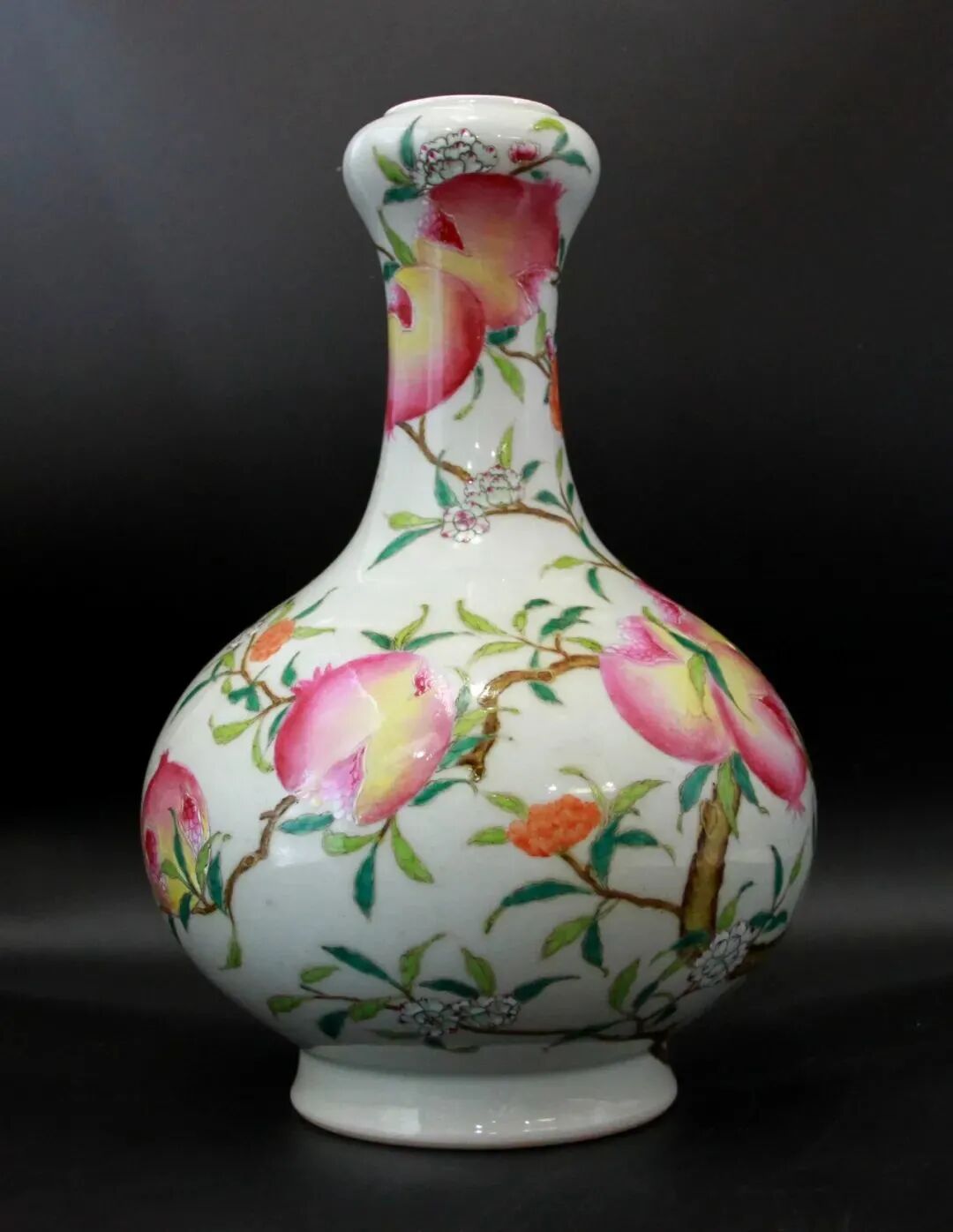 此瓶瓶口呈蒜头状,长颈,溜肩,鼓腹,圈足。瓶底有大清雍正年制款。此瓶胎体细腻,造型规整,釉面清亮,色彩艳丽又富有雅韵,颇为优美。