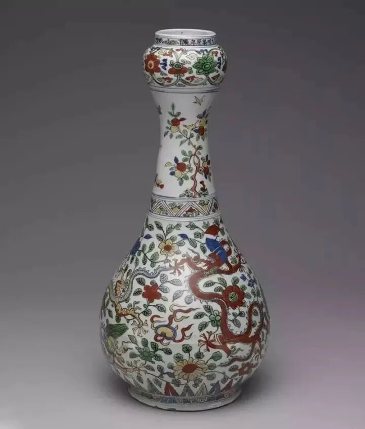 蒜头瓶自元代开始便从酒器演变成为陈设艺术品,因而其器型也开始逐渐完美,饰纹也开始丰富多彩了起来,后逐渐成为历代皇室必用之物。