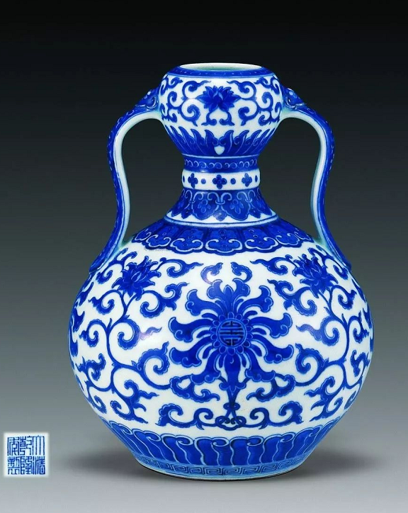 如意耳蒜瓶是清代雍正时期创新器形,乾隆时延烧。此瓶造型别致,端庄隽秀,青花头发色纯正,纹饰精致,为乾隆青花瓷中的佳作。