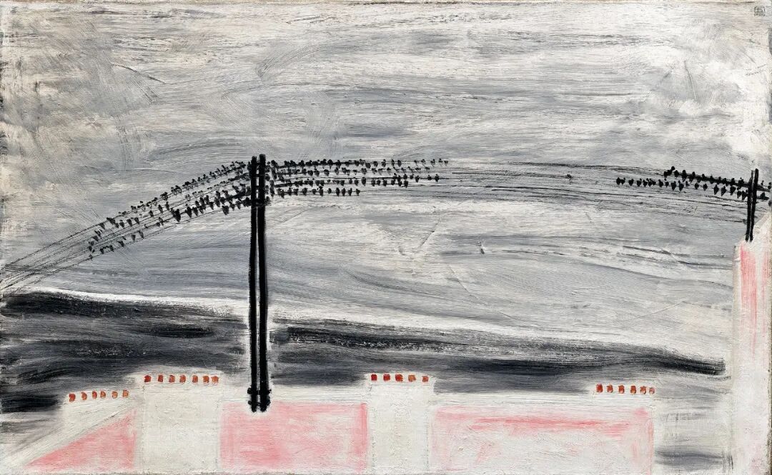 常玉作於約1931年的《電線上的麻雀》是其數十年創作生涯中唯一的「街景」作品,結合含蓄寫意的水墨意趣和現代主義凝練的創作語言,呈現藝術家旅居法國嶄露頭角之際,內心充滿東方情思的個人寫照。《電線上的麻雀》用色簡練,並以中國傳統繪畫「墨分五色」的理念,用筆刷鋪就濃淡不一的背景,營造了一個深沉浮動的空間效果,並使用當時他最為標誌性夢幻柔和的粉色來描繪街景建築,為畫面注入了一絲獨屬於巴黎的甜美和浪漫。而藝術家對於麻雀與建築的構圖,運用中國傳統繪畫虛實相生的藝術手法來塑造空靈深遠的氛圍,投射出藝術家致廣大而盡精微的世界觀與人生之道。