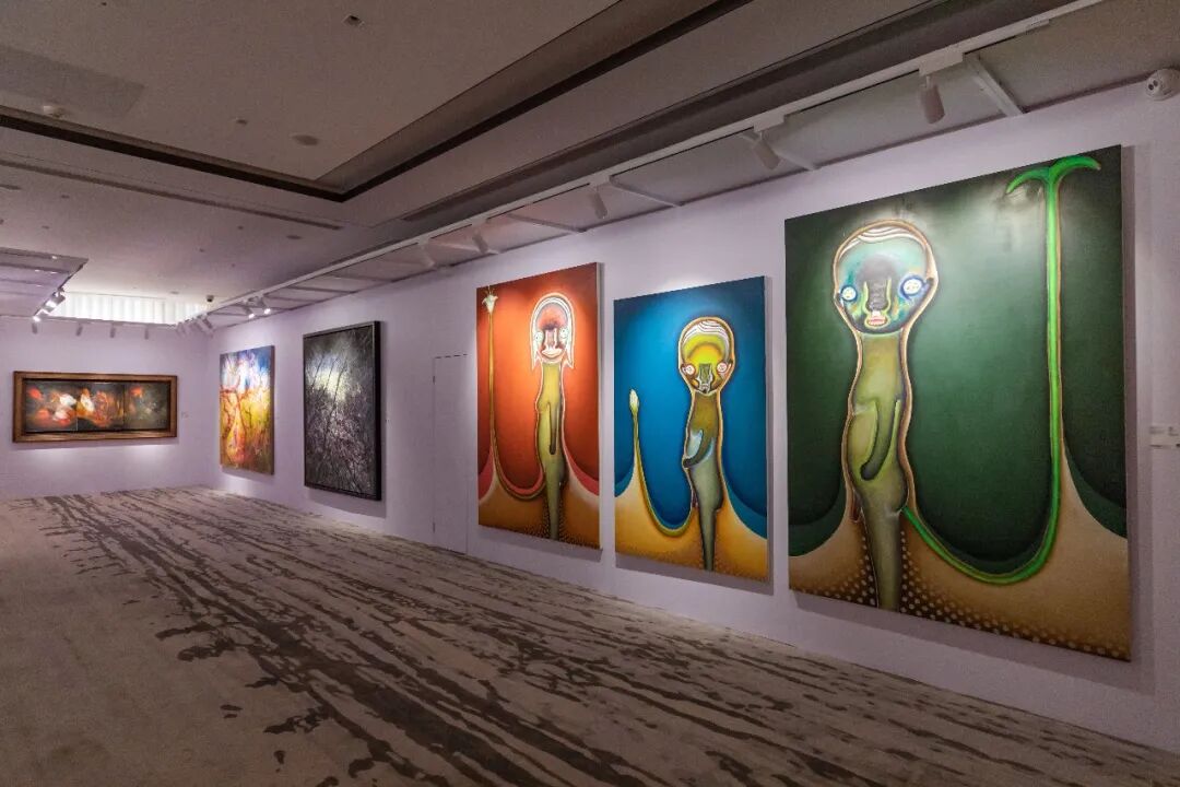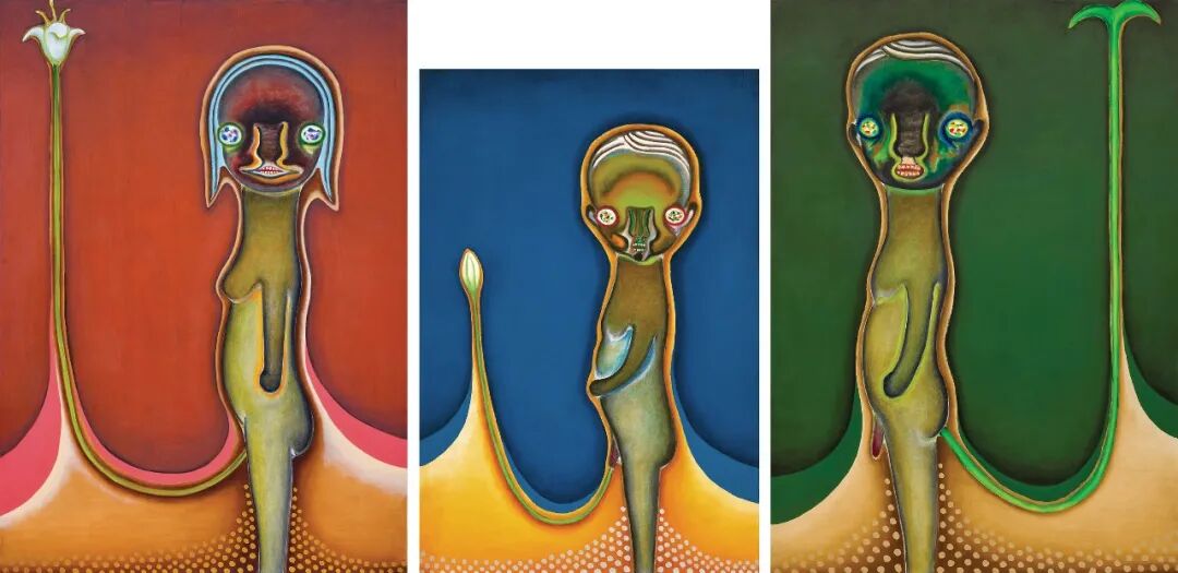 加藤泉的《無題》以三聯作的形式出發,以巨幅方式繪製了一家三口,在藝術家歷程中極其罕見,更為市場上所出現的最大尺幅畫作。每幅主角各司其職,顏色上區分進而強化了各自代表的涵義,更在尺幅上展現巧思,將「兒子」的畫布縮小,以示年齡上的差距。出身於日本古文化發源地的加藤泉對日本民間故事流傳的山靈精怪特別感興趣,畫中母體往往是介於人物、動物和植物之間的混合體,再以有機的線條或斑紋點綴,形成一個藝術家獨有的心靈產物。此組作品曾在日本廣島市現代美術館展出,可見其在藝術家心目中的份量。