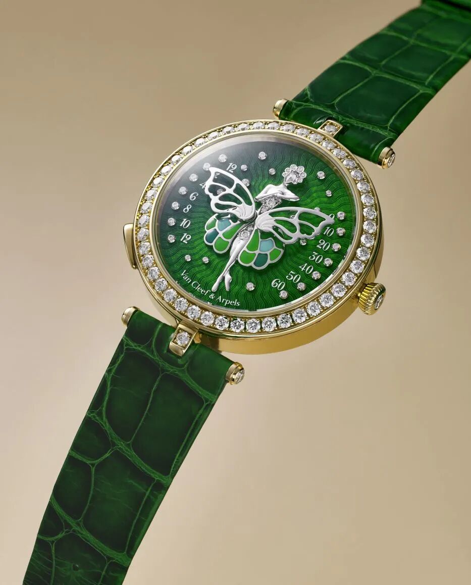 梵克雅寶 Lady Arpels Ballerine Enchantée d’Orient,靈感源於俄羅斯首席芭蕾舞女演員安娜·芙洛娃,系列於2013年推出。錶盤上身穿蝴蝶短裙的芭蕾舞者形象,彰顯了梵克雅寶長久以來高貴而優雅的主題。翠綠錶盤以大明火琺瑯燒制,浮雕打造的芭蕾舞者身上鑲嵌鑽石,舞裙採用內填琺瑯,外罩翅膀紗裙,整個畫面輕盈、光澤而富有層次感。
