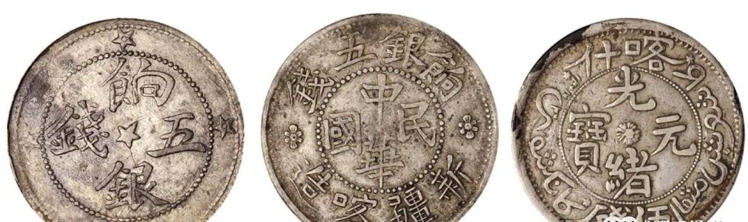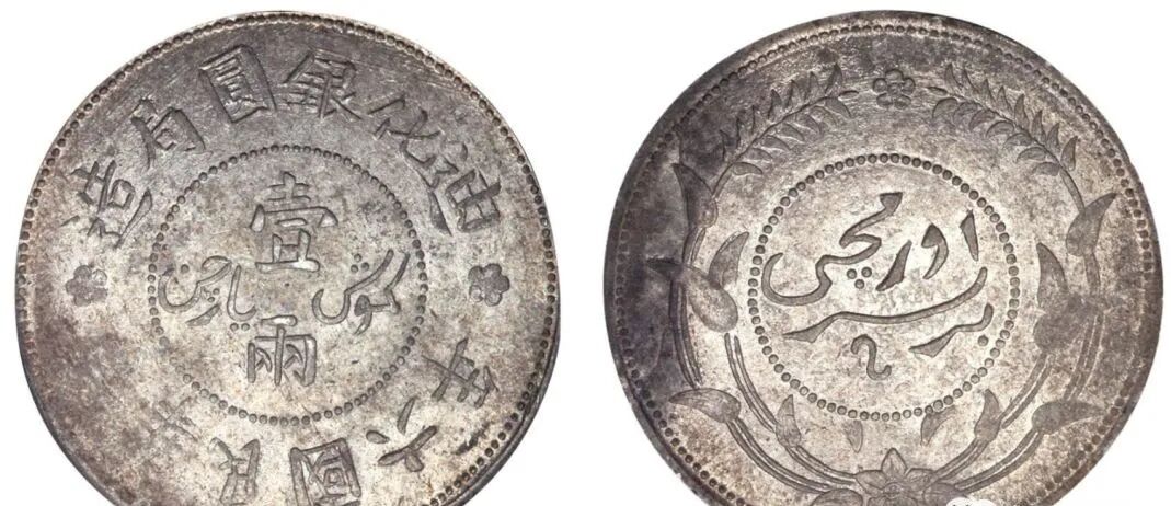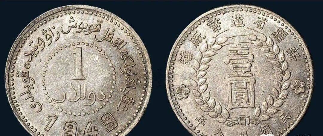 (7)、喀什小银元,喀什造小银元,系宣统三年(1911年)铸,分叁钱、二钱两种面值。其中叁钱银圆正面为汉文“银圆叁钱”,中心有大花;背面中间珠圈内为蟠龙图案,圈外下方为维吾尔文“喀什造.叁钱回历1329年,两侧各一个小五角星。”(8)、喀什民国饷银五钱,喀什于民国二年至五年铸“饷银五钱”,并采用阿文纪年。钱币正面字全为汉文,中间珠圈内为“中华民国”,圈外上方为“饷银五钱”,下方为“新疆喀造”;背面有象征五族共和的两面交叉五色旗(北洋政府国旗,旗上五色象征汉、满、蒙、回、藏),上为维文“中华民国”,下为维文“饷银五钱”。该币面值仅有五钱一种,但细微差异的版别很多。阿克苏铸造的银元数量最少,铸币时间也仅从光绪十九年起至光绪二十一年,共三年。阿克苏所铸银元,正面全为汉文,中间竖写“光绪银元”,右边竖写“阿城”、左边竖写“伍钱”;背面为环绕双叶花饰,中间为维文“阿克苏.五钱回历1310年”,背面图案具有西方阿拉伯国家钱币风格。该套银元面值有伍钱、三钱、二钱、一钱四种。1947年5月至1948年底,泛伊斯兰主义和泛突厥主义的头号代表麦斯武德出任新疆联合政府主席。财政当局利用盛世才时期与中央银行签订的500万金卢布贷款运来的样板银,背着国民党中央政府,由迪化(乌鲁木齐的旧称)水磨沟机器局造币厂铸造银元,其形式和重量与“袁大头”相似,并发行银元票,规定银元票1元,兑换新疆铸造的银元1元。