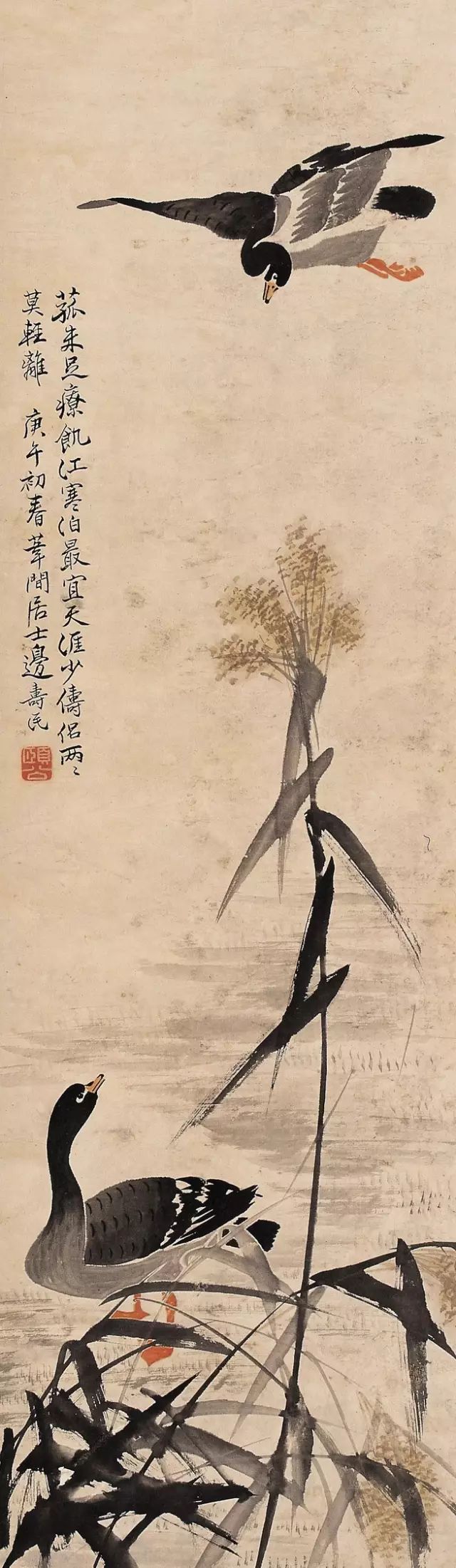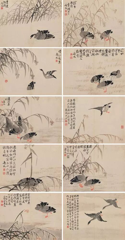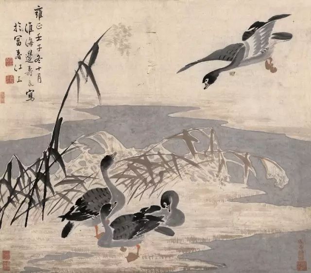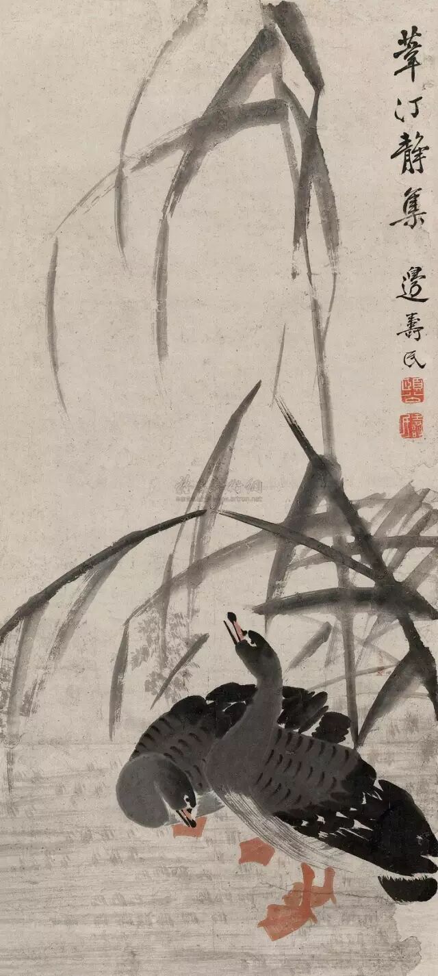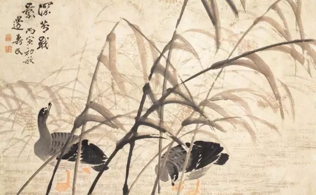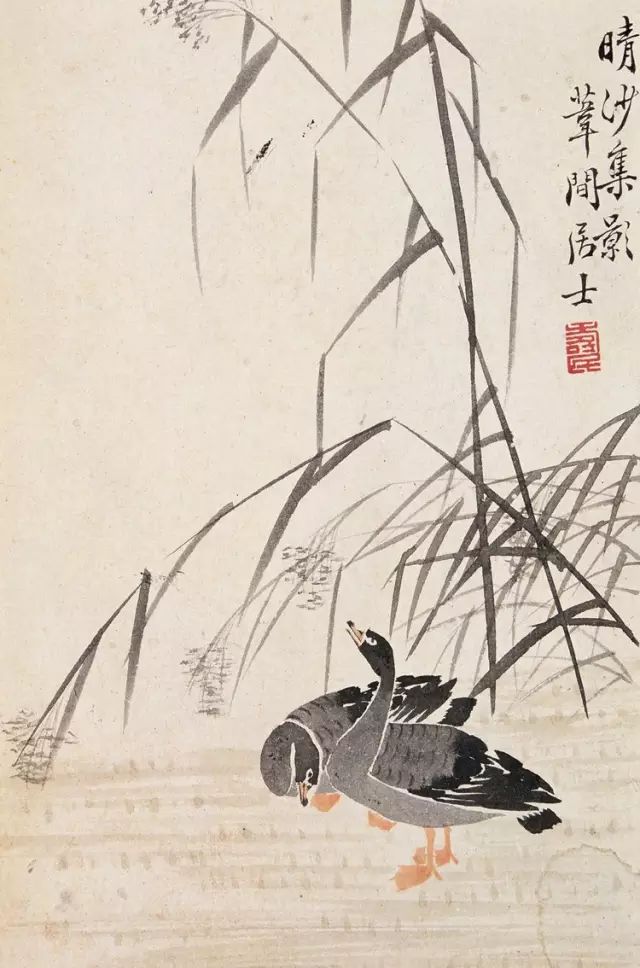 芦雁倾注了边寿民一生的心血。他笔下的泼墨芦雁,苍浑生动,朴古奇逸,曲尽其态。边寿民还以墨竹法写芦,疏而遒劲,更使他的笔下的芦雁图交映生辉、出神入化。