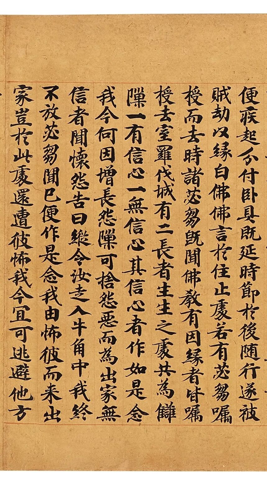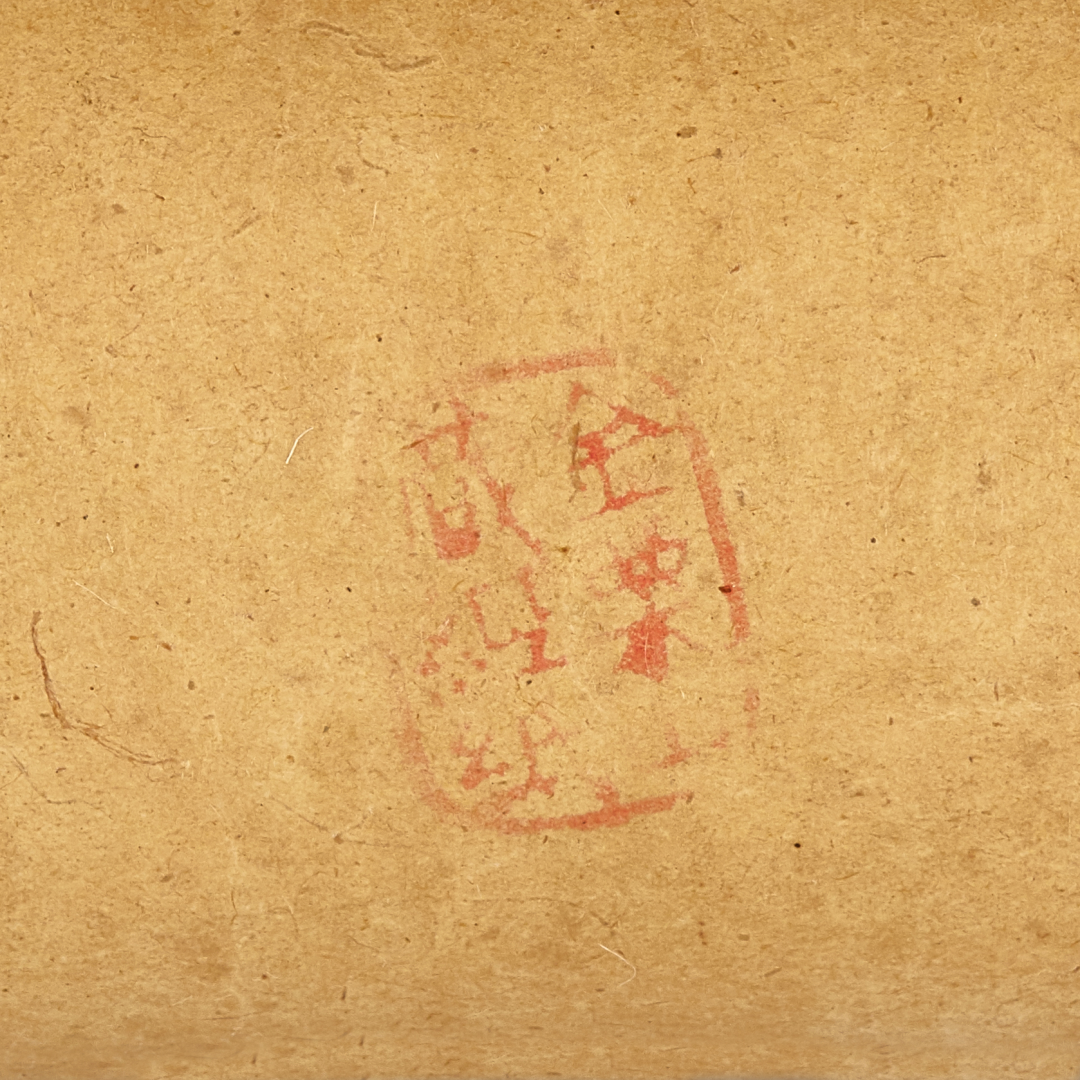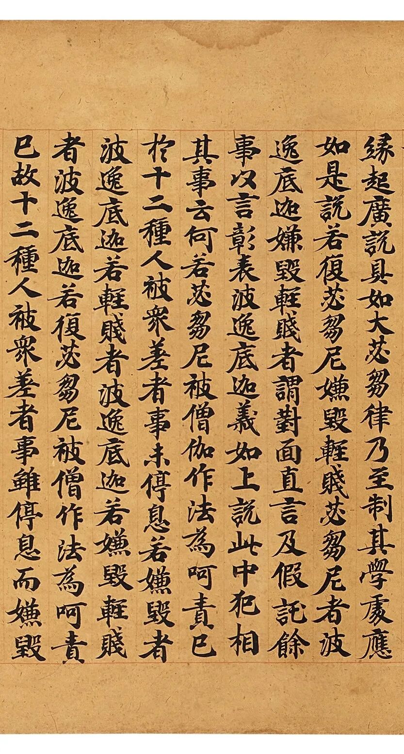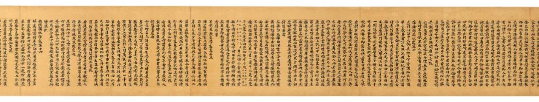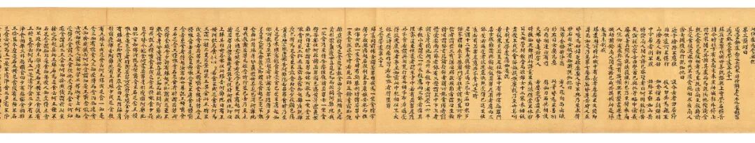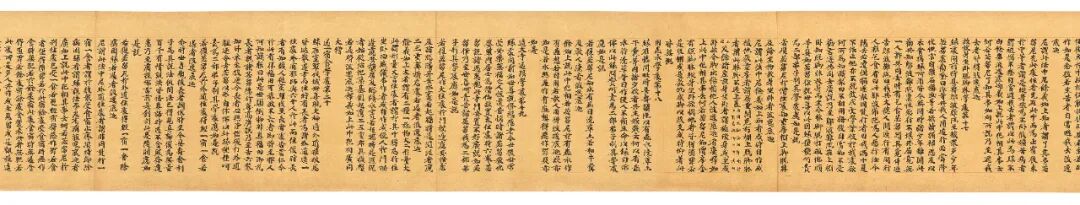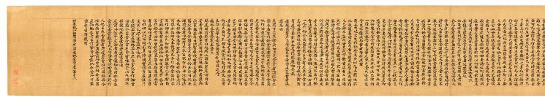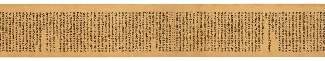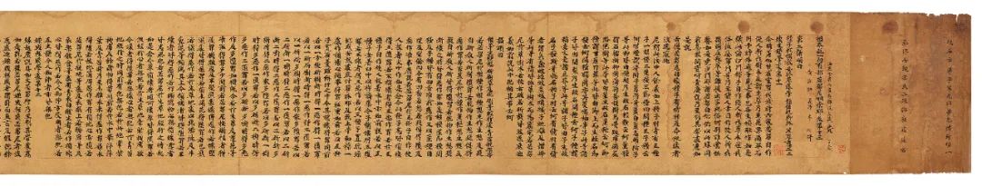 注:本幅以十九张金粟山写经纸连接而成,首尾全,于前有记「一十九纸」。宋代禅院因人手及技术,每纸长皆约60厘米,高约28-32厘米,乃以宋三司布帛法度高一尺七寸,长三尺三寸制成。以蚕丝入纸,添有植物黏液、胡椒或辣椒等驱虫之物,将皮纸多层重迭培干成厚,故纤维匀细,纸质坚韧,内外皆蜡,用以供奉。因此,后世人文常揭多层用之,如文征明、祝允明更甚者乾隆皇帝,所用皆为揭裱后之藏经纸背面,故见小印「金粟山藏经纸」于前。综观公私收藏,若本幅完整无揭,前后皆蜡之海盐金粟山写经,寥若晨星,识者珍之。