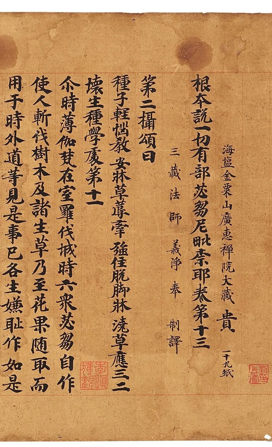 宋人写经多用于供奉,由信众出资,延请禅院内抄经生书经书数份,供于院内,以祈求保佑。以本幅为例,经前书有「陕石市弟子朱九翱弟九璘舍经一」、「亟保母亲宋氏二娘妳疾痊除者」,可知此《根本说一切有部苾刍尼毗奈耶卷》为浙江陕石(今海昌)信徒仲昆朱九翱及朱九璘为其母宋氏祈求康复之用。