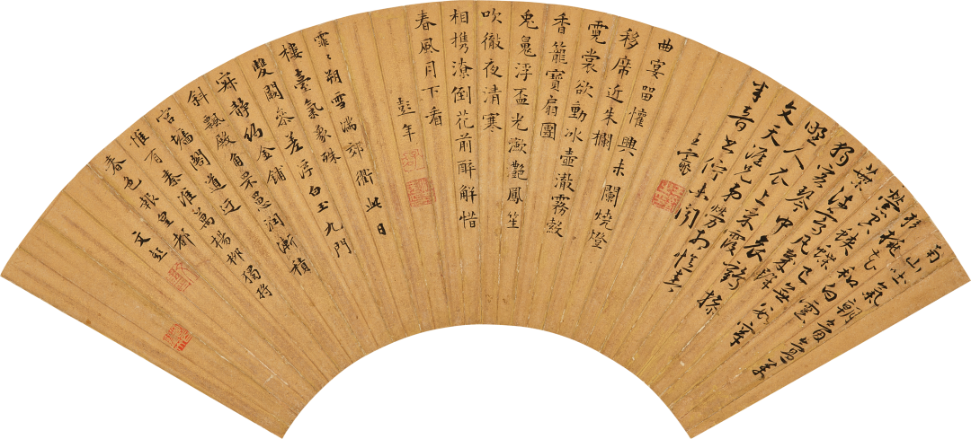 注:本幅共六首御制诗,皆赐予群臣或与群臣唱和,其中《大学士于敏中乞翎帽黄褂笑而俞之并成是什仍命和韵》纪绿了于敏中位极人臣的一段逸史。1774年,小金川之役起,乾隆外遣阿桂为首的精兵猛将统兵,内以于敏中为首的文臣综理国政,并对于氏有「自川省用兵以来,书旨查办,始终是经其手」的高度评价。1776年正月金川大捷,于敏中趁势乞求乾隆帝「翎帽黄褂」之赏,此等奖赏自有清以来只有满族武将获军功可佩,乾隆帝放下汉臣之分,允了于氏,并书此诗志事,对君王来说完成了对汉臣的拢络,于氏则是站稳乾隆朝汉臣的巅峰。