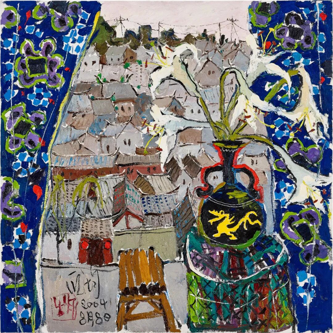 「2004年,我带着一批画家前往云南丽江采风、写生,那是一次颇为痛苦的经历。因为不适应高原的环境,下榻丽江古城就病倒住进了医院……最最遗憾的还是我失掉了最最宝贵的写生光阴。出院后我立即要求上山写生古城全貌,那一遍黑灰色的屋瓦感动了我……我已经感受到不虚此行。同时我又写生了那古老的街道,最后的日子:长途跋涉,带病去到香格里拉,画了阿斯玛的故乡。留在我脑海中的就是那个难忘的丽江古城,我吸取到了少数民族乡土气的原味,忘不了窗外古城的感觉,也就在2004年8月8日我的生日画了这一幅作品。」