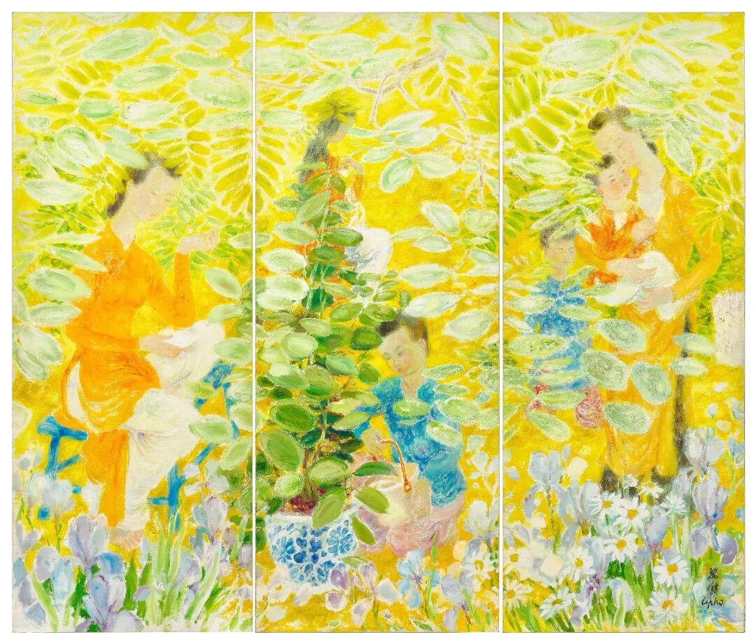 黎谱的《庭园人物》是艺术家传世最大尺幅的作品,亦是拍场上唯一的三联屏巨作,珍罕程度可想而知。本作不仅画幅宏大,色调亦尤其鲜艳活泼;画中六人浸淫在金光灿烂的温暖阳光之下,与花草共舞,留下一幕动人美景。
