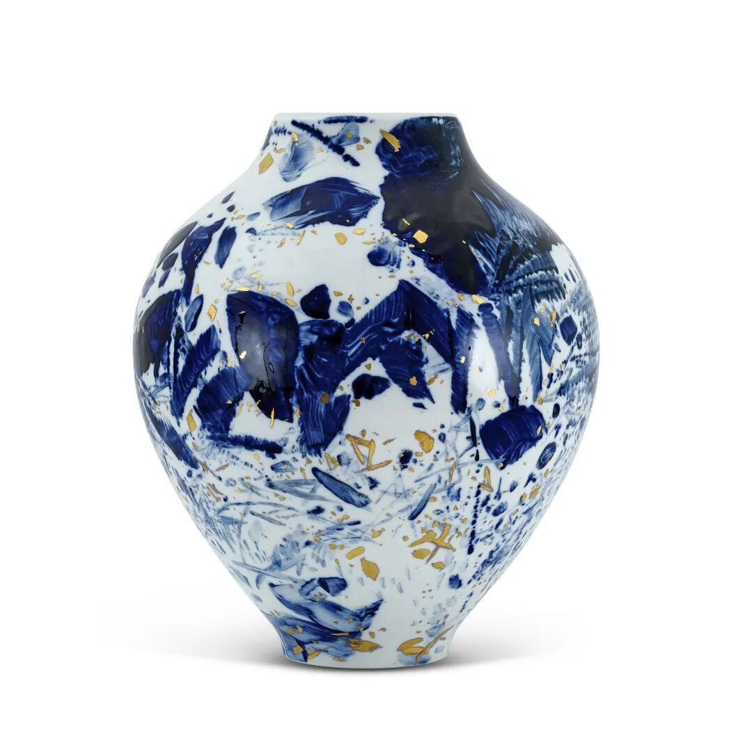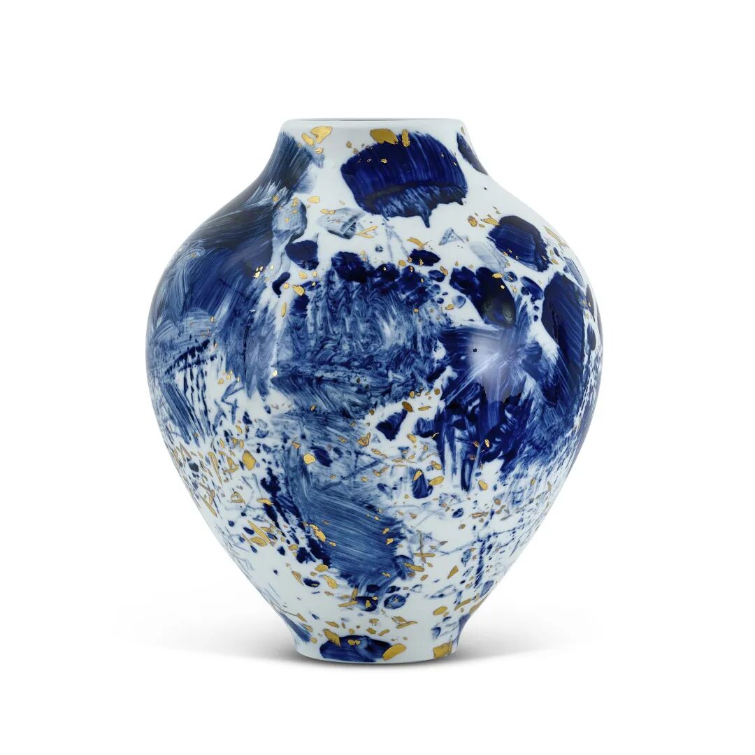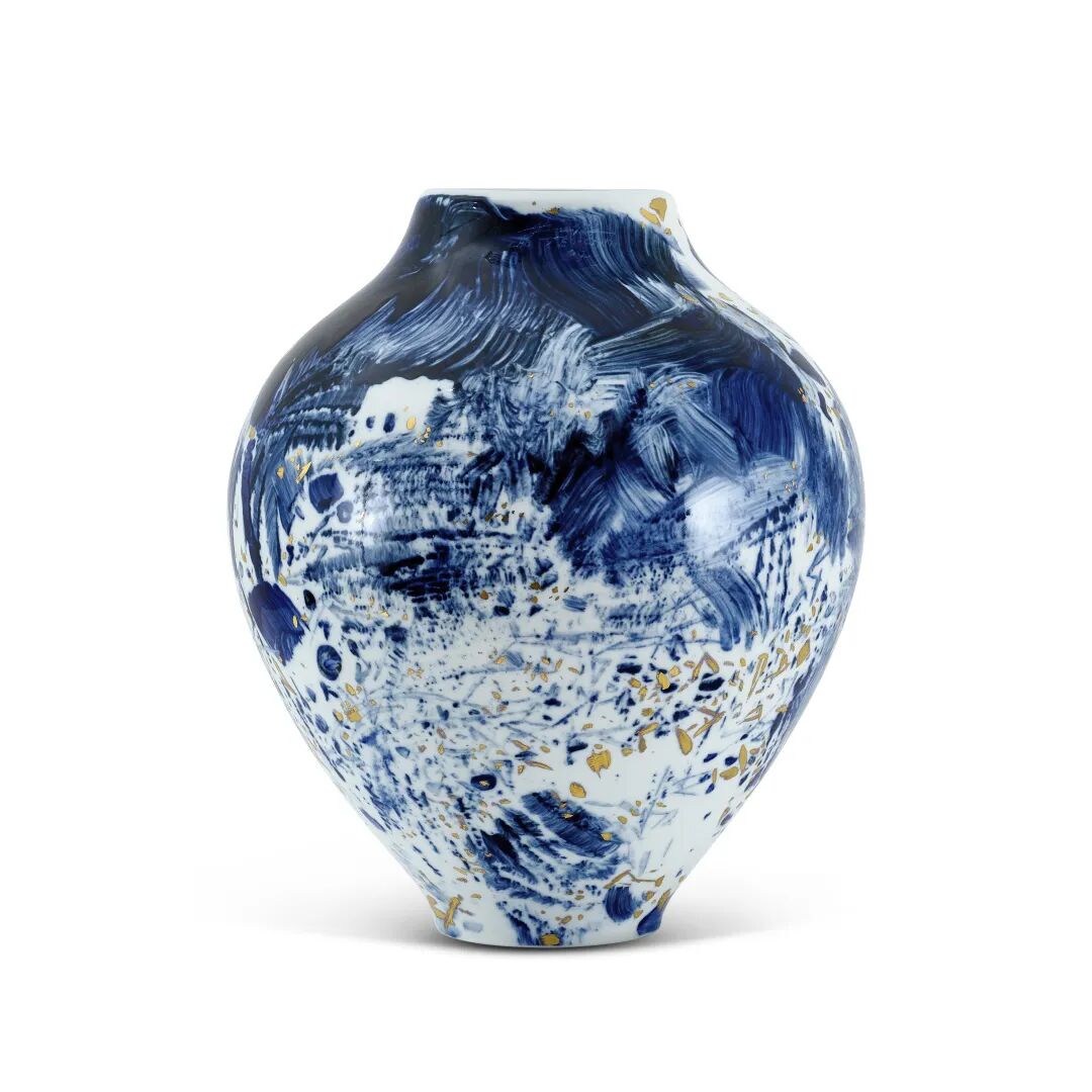 《雪白灿金蔚蓝系列第24号》是朱德群于2007至2008年间在塞夫尔国家制造厂铸造的57件独一无二手绘金箔釉上彩瓷之其一;同系列中首度有作品上拍,蔚为难得。艺术家以元青花为器型与色彩为灵感,于本尊瓷器以著名的塞夫尔蓝色渲染着色,并有闪耀的金箔点缀,将朱德群源于布面的抒情抽象风格,放诸立体的高雅瓷瓶,展现了另一种独特迷人的艺术魅力。本作曾展出于巴黎吉美艺术博物馆、北京中国美术馆、香港大学美术博物馆、澳门艺术博物馆及纽约马博罗画廊,展历十分精彩。