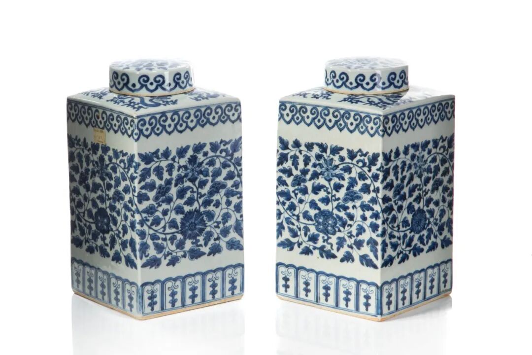 Lot 1053 约1800年 青花缠枝花卉纹方罐一对