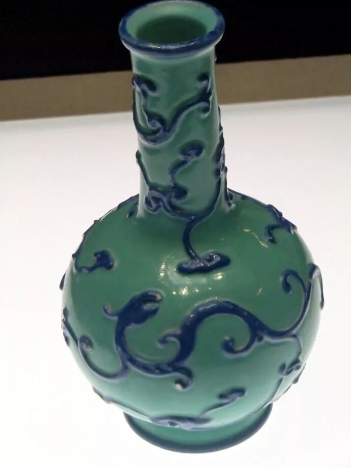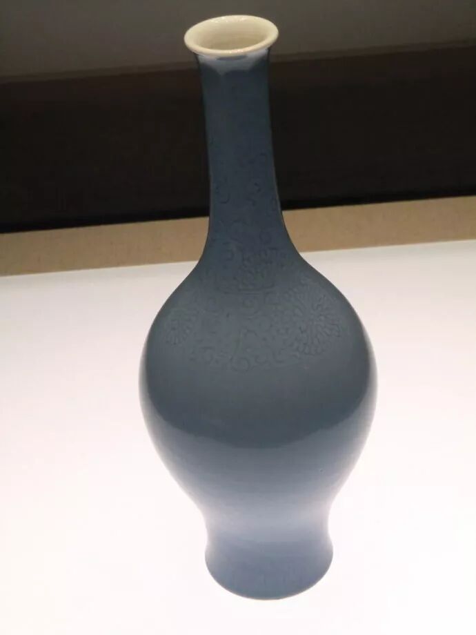 天蓝釉刻菊花纹长颈瓶,清康熙