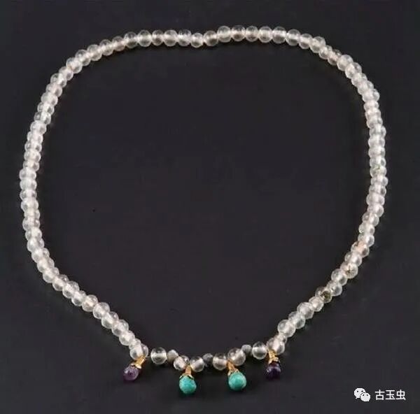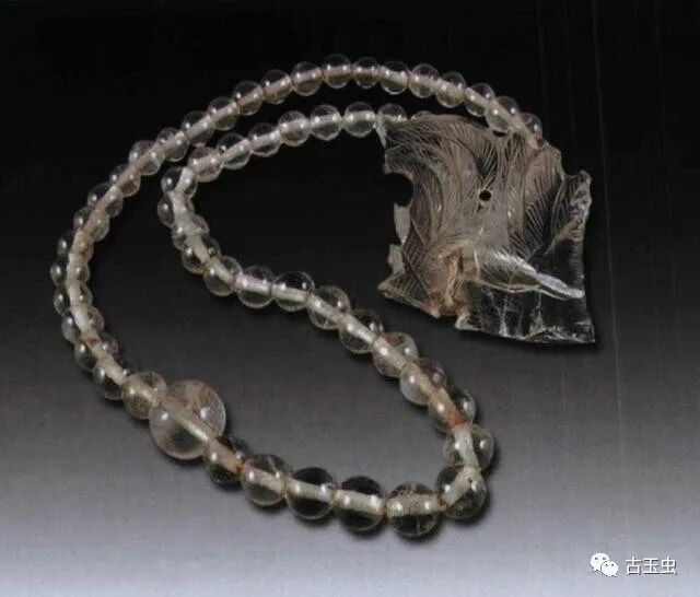 水晶项链,北宋,江西省鄱阳县团林公东湖生产队宋墓出土。长10.5、宽6.9、大珠直径1.4、小珠直径0.9厘米,可惜的是水晶牌残缺。