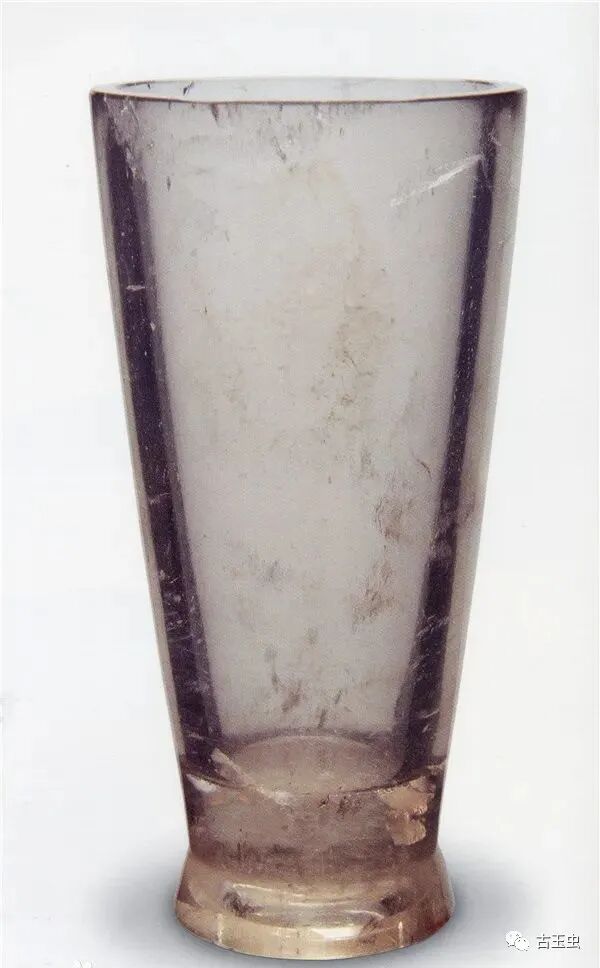此杯是用整块优质的天然水晶雕琢而成,整体晶莹剔透,浑然天成,杯高15.4cm、口径7.8cm、底径5.4cm。整器略带淡琥珀色,局部可见絮状包裹体;器身为敞口,平唇,斜直壁,圆底,圈足外撇;光素无纹,造型简洁。