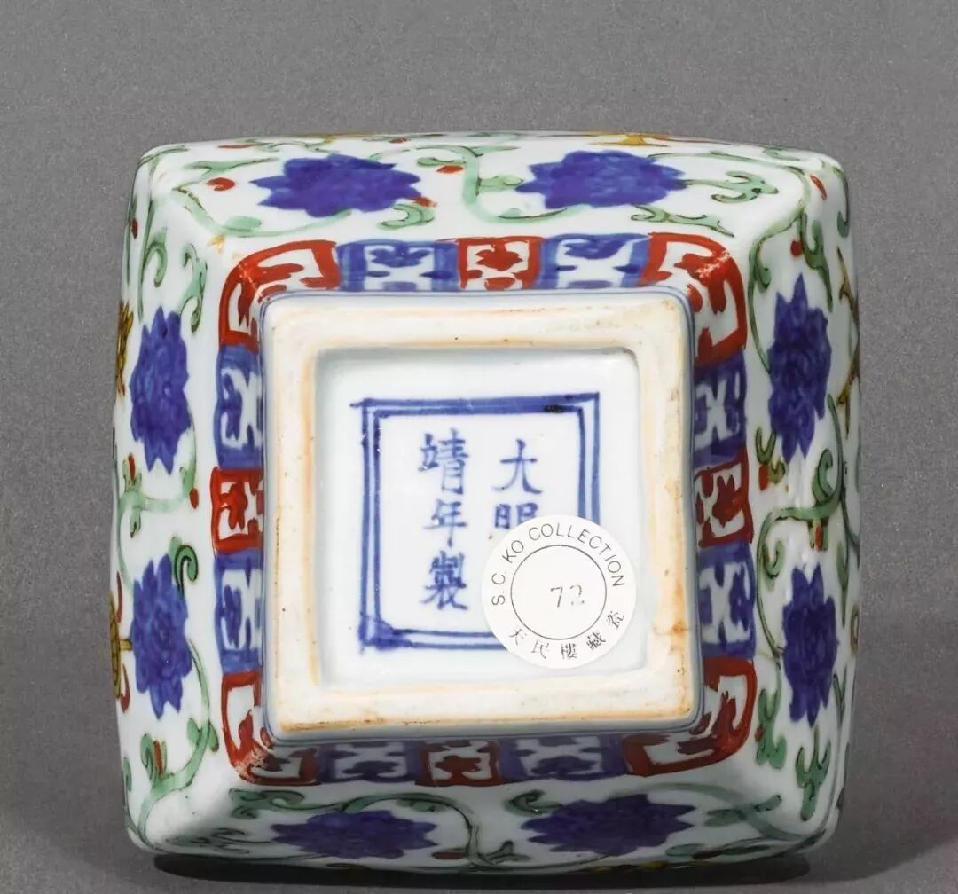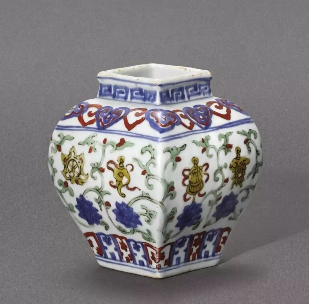 明嘉靖 五彩缠枝莲托八吉祥纹方罐(43.8万)