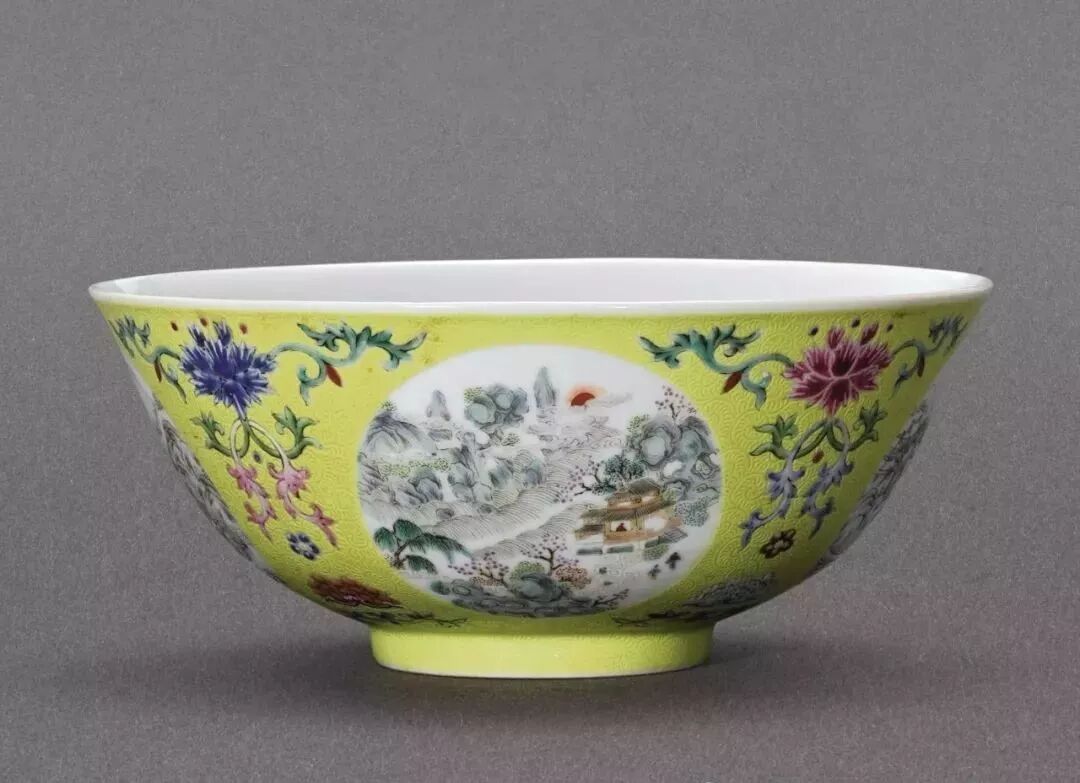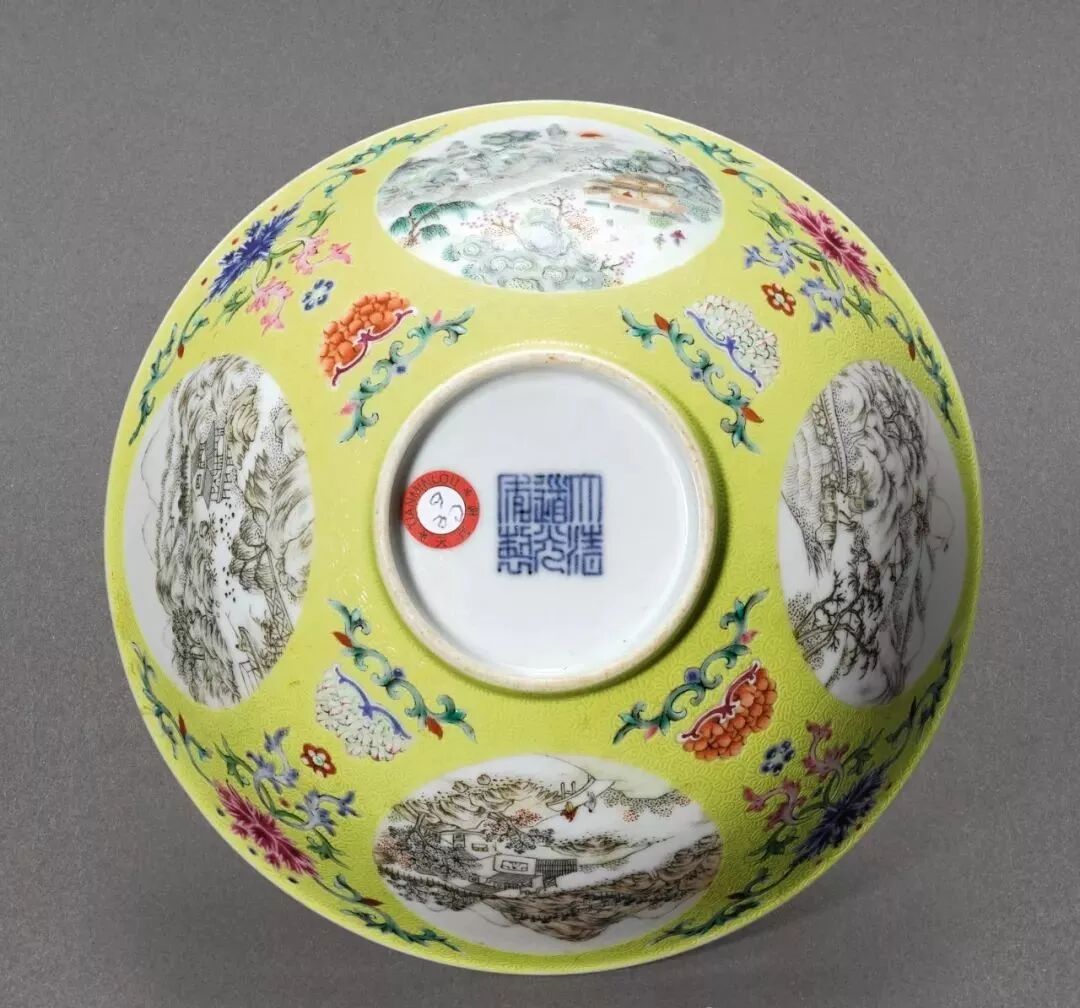 清道光 粉彩黄地轧道开光山水图碗(16万)
