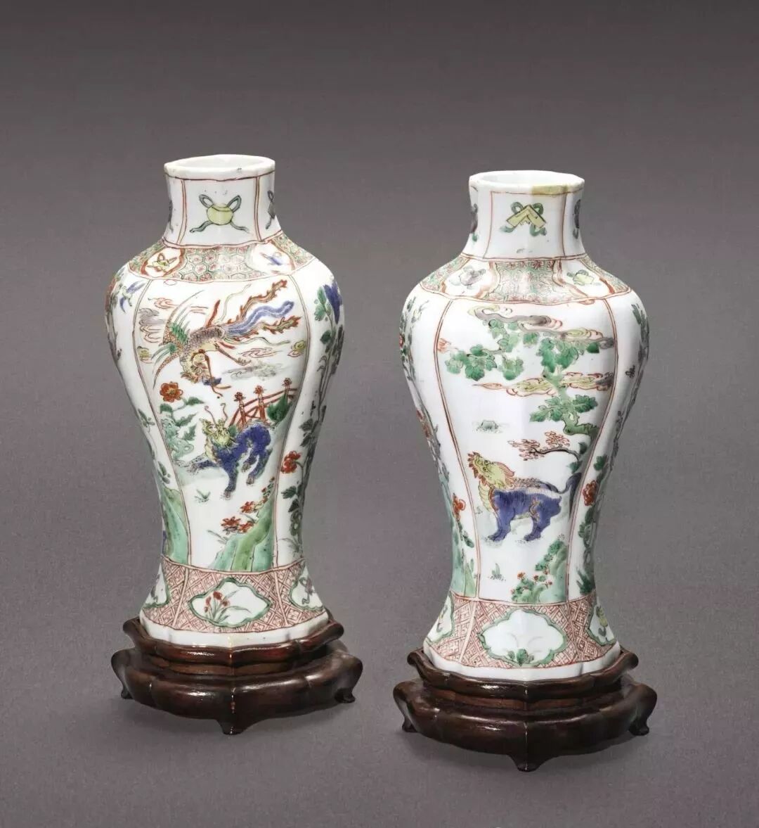 清康熙 五彩瑞兽图瓜棱瓶一对(7.5万)