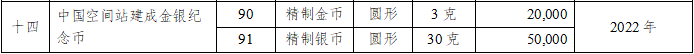 根据中国人民银行公告的纪念币发行计划,今年计划发行中国空间站建成金银纪念币一套,包含3克金币和30克银币各一枚。