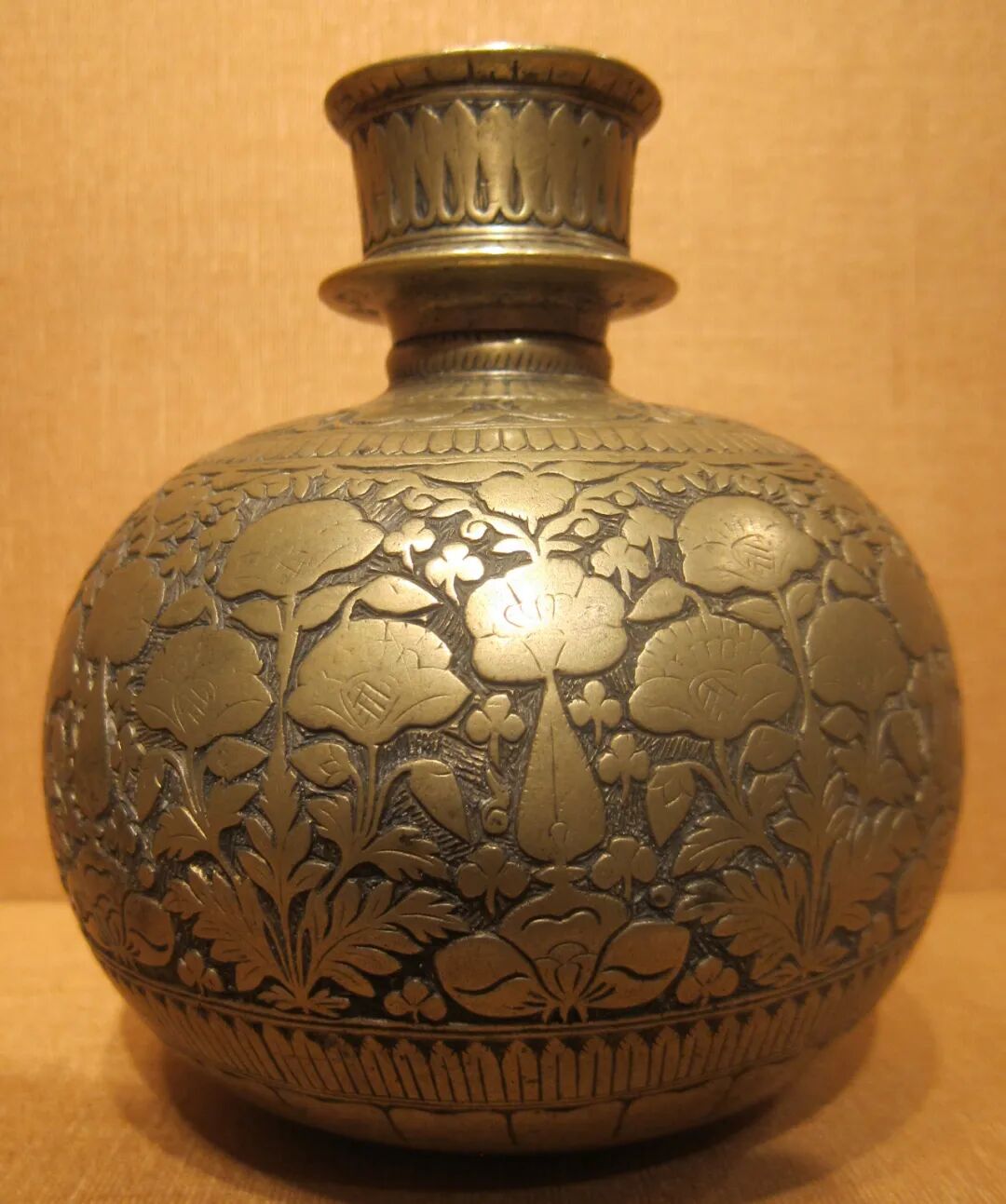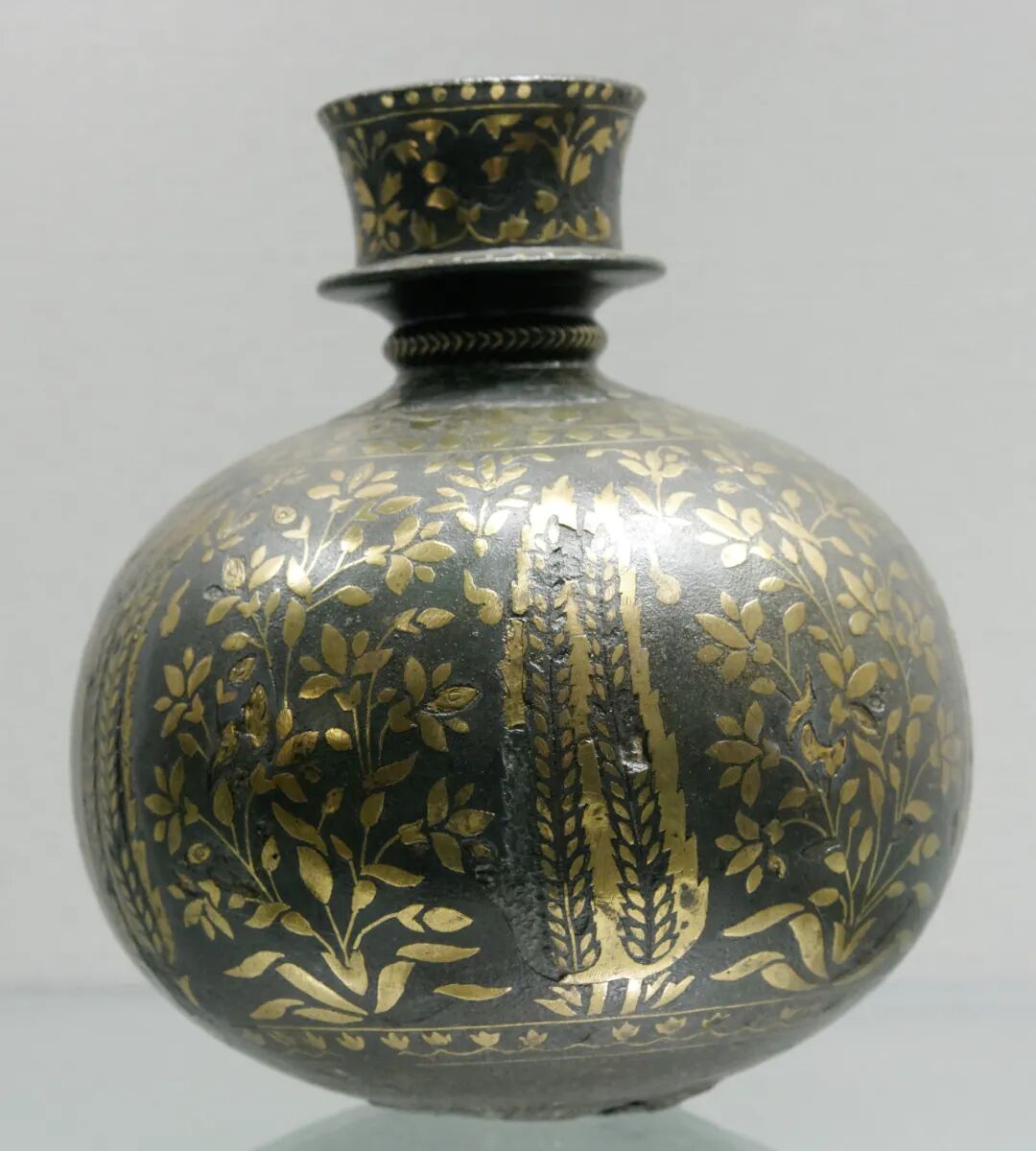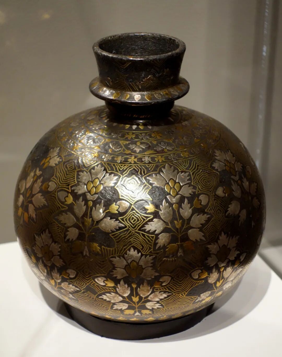 印度南部德干高原制作的铜合金水烟壶器型浑圆,状若“嘟噜瓶”,壶身表面上还镶嵌其他种类的金属,通过金属色差形成瑰丽的花卉纹饰。![]()