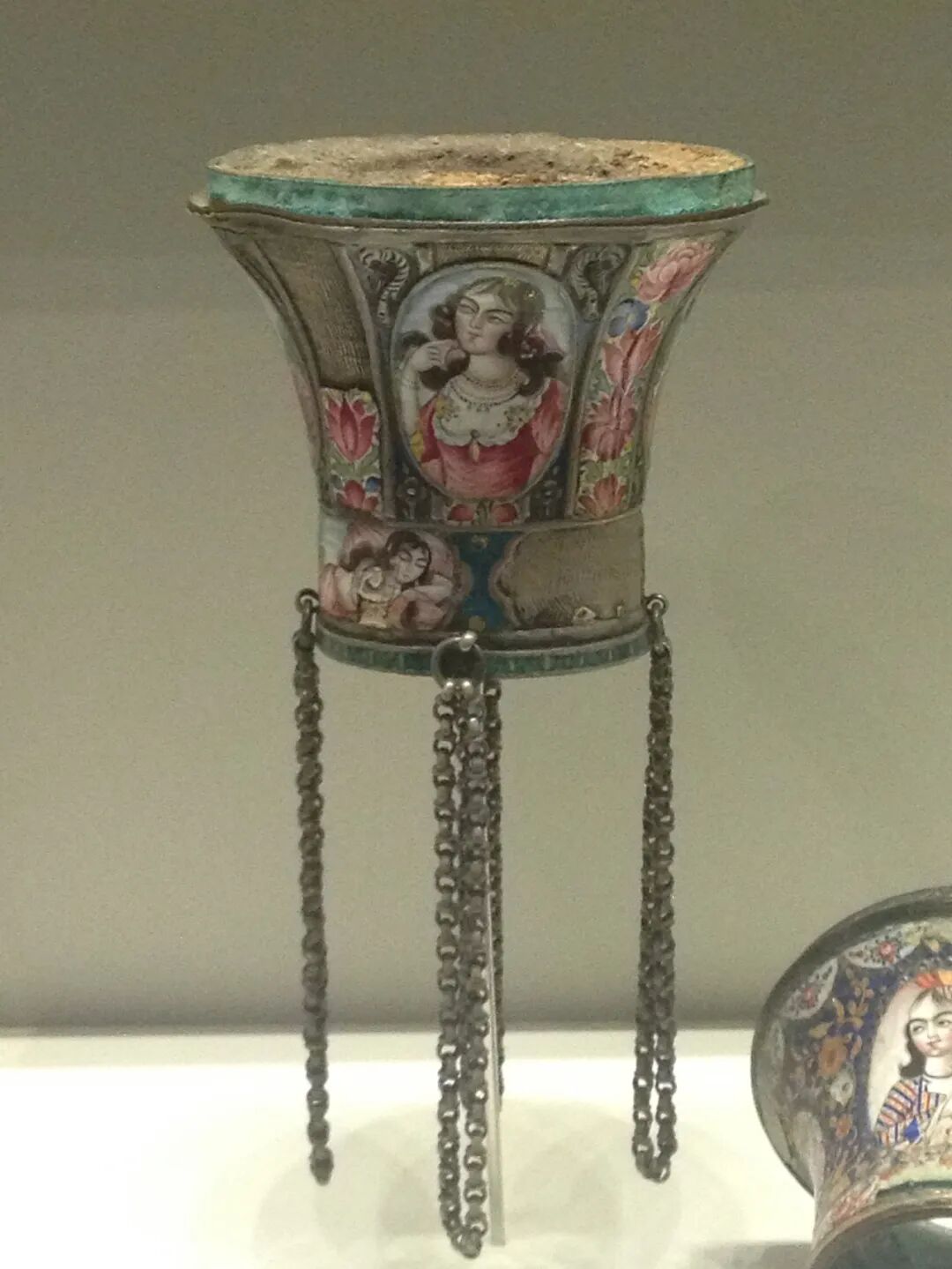 不仅浑厚的金属水烟壶被装饰得大气中尤见细节,就连纤小的烟斗也能穷尽审美之趣。例如这只小巧的波斯银质烟斗,方寸间珐琅彩人物眉目传情,香艳之气溢于画面。![]()
