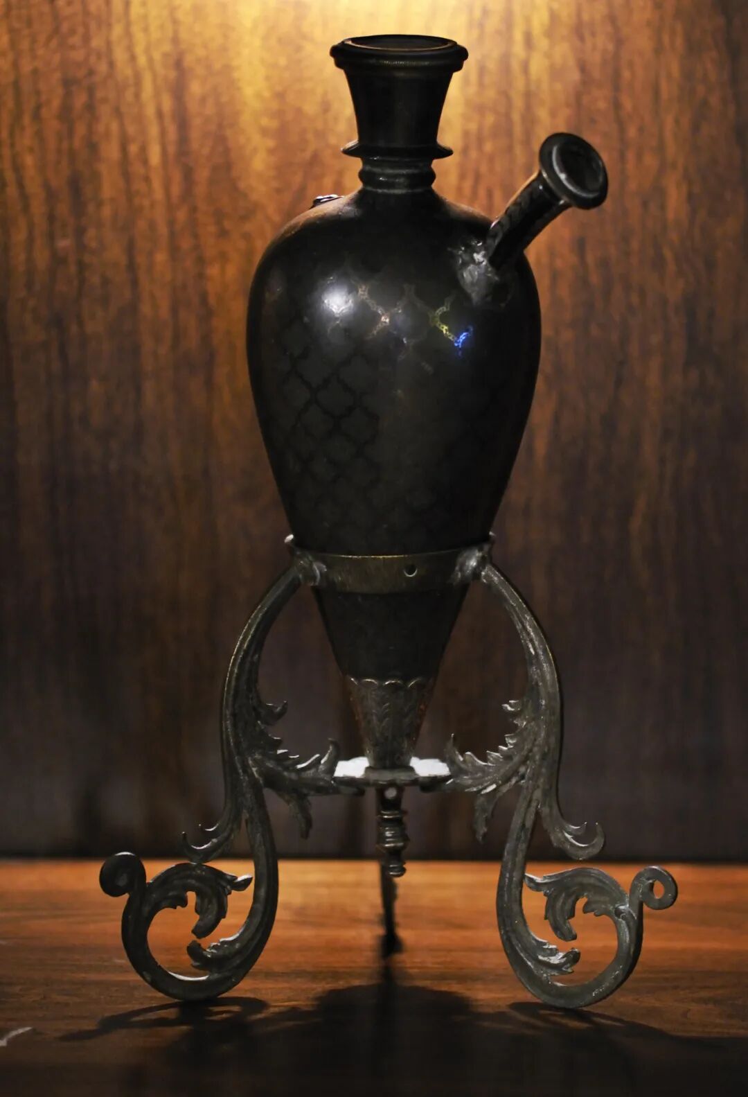 金属水烟壶里有一种尖底瓶,袭用了古埃及人咂酒时的酿酒器,目的也是想借助尖底将烟中的焦油等渣滓沉淀下来,但尖底水烟壶在使用过程中必须配有支架,这一点也和古代的咂酒器如出一辙。![]()