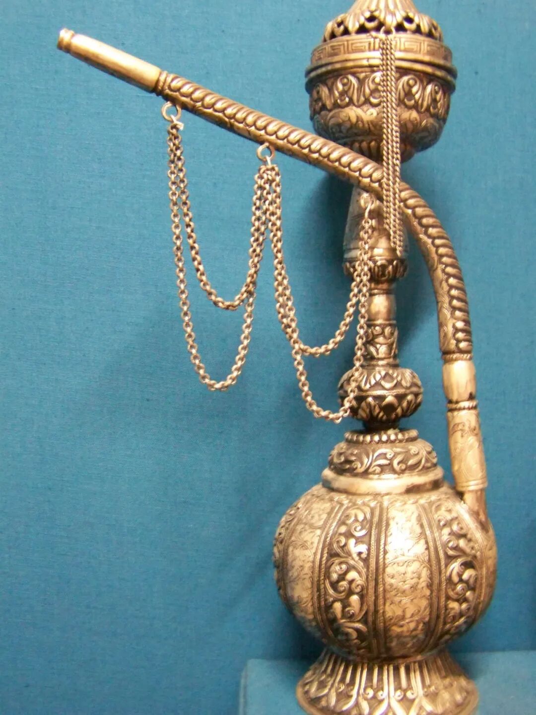 此外,还有一种覆钟形水烟壶也可用金属制造,这种形状的水烟沉稳大气,特别适合战士使用。当然,它那硕大敦实的体量和盘曲的粗笨软管有时会让人误以为是吸尘器。![]()
