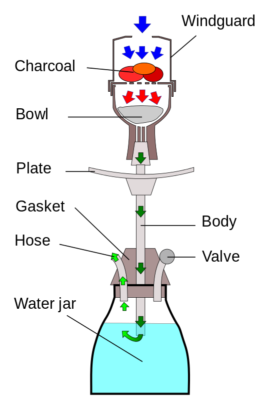水烟兴起于中世纪的波斯和印度,在美洲的烟草传入旧大陆之前,这里的人们普遍在宗教仪式或娱乐活动中吸食致幻效果更强烈的大麻和鸦片。随着烟草的普及,水烟流被更加广泛,不同地区的水烟器具也呈现出各自的地方特色,但就其构造原理而言却大体趋同:它们的主体都是一个鼓腹小口的盛水容器,器口上方可以插一个装烟草的烟斗,烟斗下方的管子浸入水中,出烟孔则开在水烟壶的侧面,也可以设计在壶口处。水烟壶可供一个人单独吸,也有多孔水烟供大家一起众乐乐。而吸烟软管的出现不会早于1560年代,之前人们肯定有其他材质的吸管,只要把它们从咂酒的用途移植过来就行了。吸烟者相信,烟经过水的过滤会降低烟毒,实际上这种认知并不科学,就像这世上不存在绝对安全的“洗米”神器一样。![]()