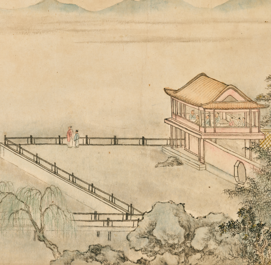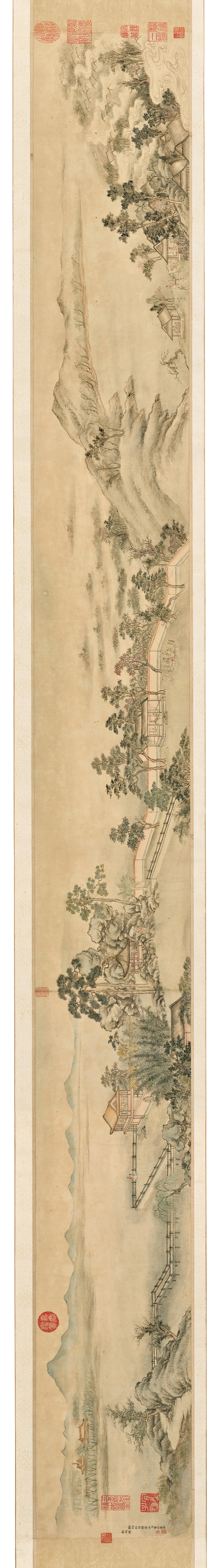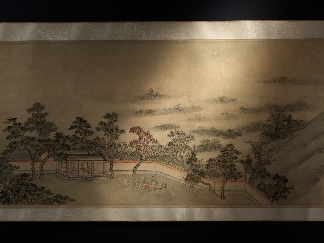 介乎乾隆御诗与词臣和唱的山水画一段,则由董邦达绘制。开首为烟云缭绕的树林房舍,「风月今宵非等闲」,一组人物在户外摆设了供桌翘首拜月,另一组人物则围坐在亭内赏景,好不热闹,并以一抹环山抱水作段落,一片「好秋光」,也描绘出「西华一镜挂东山」的美景。画卷中段,在庭院中有一另家十数人聚首畅谈,乐也融融。接后有儒者在山涧池旁观水,「可识春光也让秋」,而树丛后也有一组人物在楼阁内观景,「不须重拓影娥池」。最后以平远山水作结,引领着楼阁前面凭栏远眺的人物视线,将画意推向无限寥廓的远方。全卷整体气氛清雅,用笔钩勒细腻,墨色精良,多以轻笔皴擦,部局严谨,以对应乾隆诗文,诗画呼应,匠心独运。
