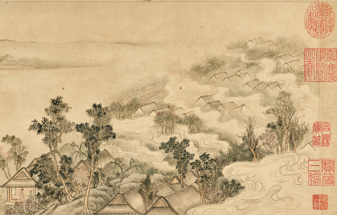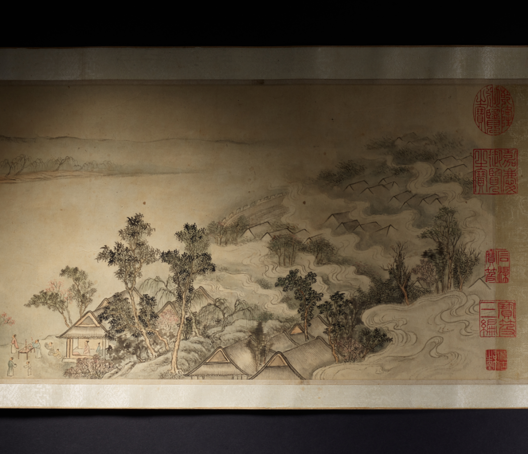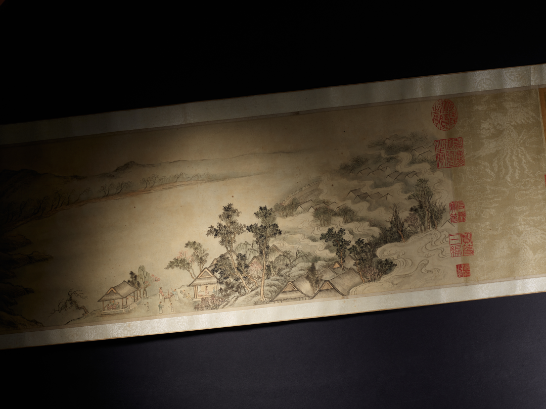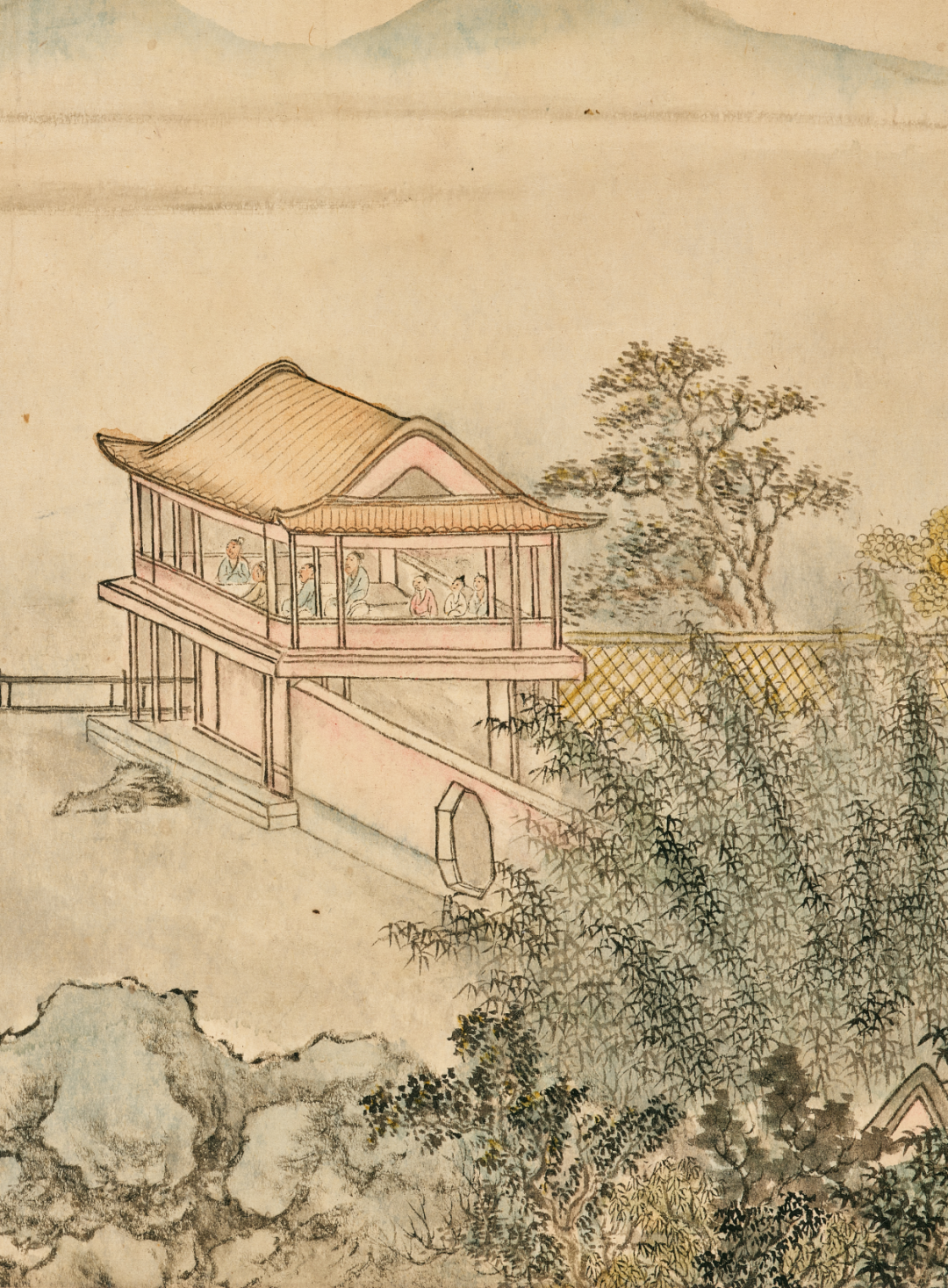 介乎乾隆御诗与词臣和唱的山水画一段,则由董邦达绘制。开首为烟云缭绕的树林房舍,「风月今宵非等闲」,一组人物在户外摆设了供桌翘首拜月,另一组人物则围坐在亭内赏景,好不热闹,并以一抹环山抱水作段落,一片「好秋光」,也描绘出「西华一镜挂东山」的美景。画卷中段,在庭院中有一另家十数人聚首畅谈,乐也融融。接后有儒者在山涧池旁观水,「可识春光也让秋」,而树丛后也有一组人物在楼阁内观景,「不须重拓影娥池」。最后以平远山水作结,引领着楼阁前面凭栏远眺的人物视线,将画意推向无限寥廓的远方。全卷整体气氛清雅,用笔钩勒细腻,墨色精良,多以轻笔皴擦,部局严谨,以对应乾隆诗文,诗画呼应,匠心独运。