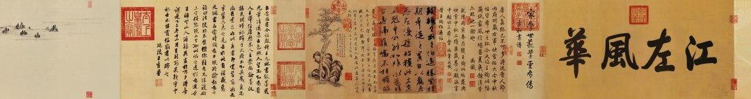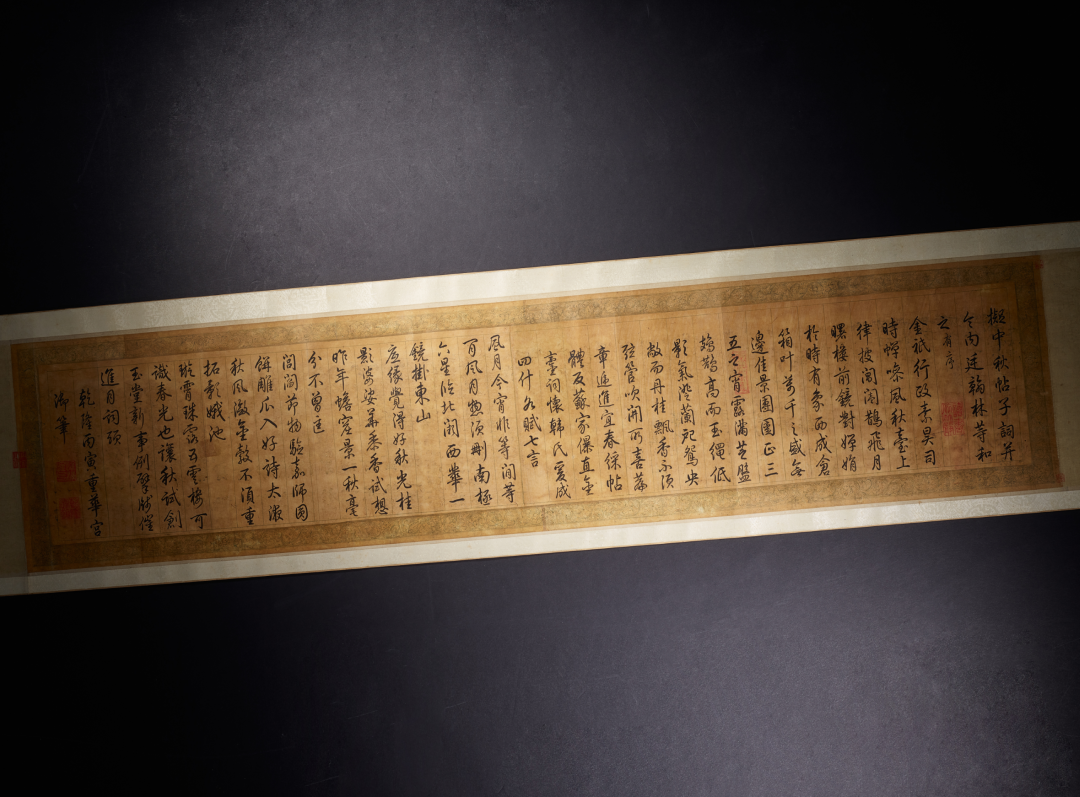至于《中秋帖》所衍生出来的作品,可说始于同年八月乾隆书《拟中秋帖子词有序》七律四章,此篇书法装裱在《中秋帖》后成题跋,诗末提及「乾隆丙寅八月拟成此词,既命内廷词臣属和,适橅大令《中秋帖》,因录于卷后。际此良时,实获心赏,并志之以纪几余雅兴,三希堂御笔。」随后,便命董邦达就《拟中秋帖子词有序》绘画,配以内廷翰林诗文和作,把整个过程都以笔墨纪录下来,成一件独立作品,亦即本拍品——乾隆、董邦达《中秋帖子词卷》。