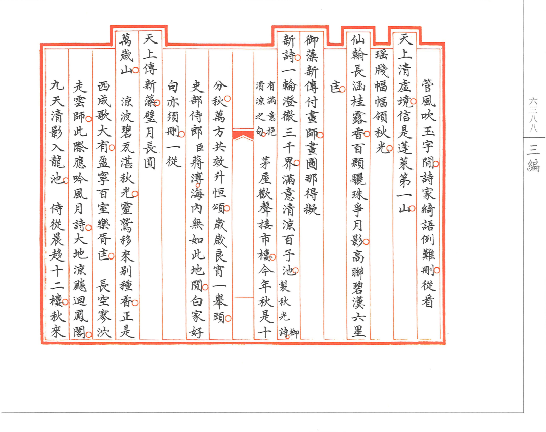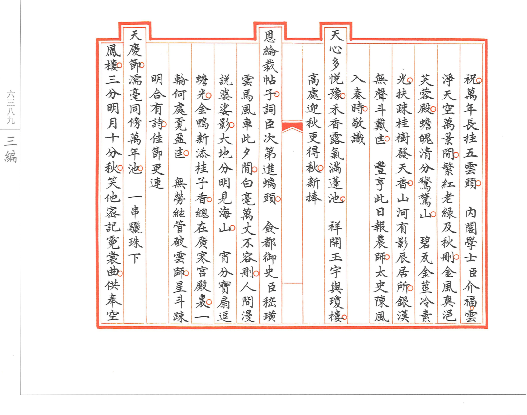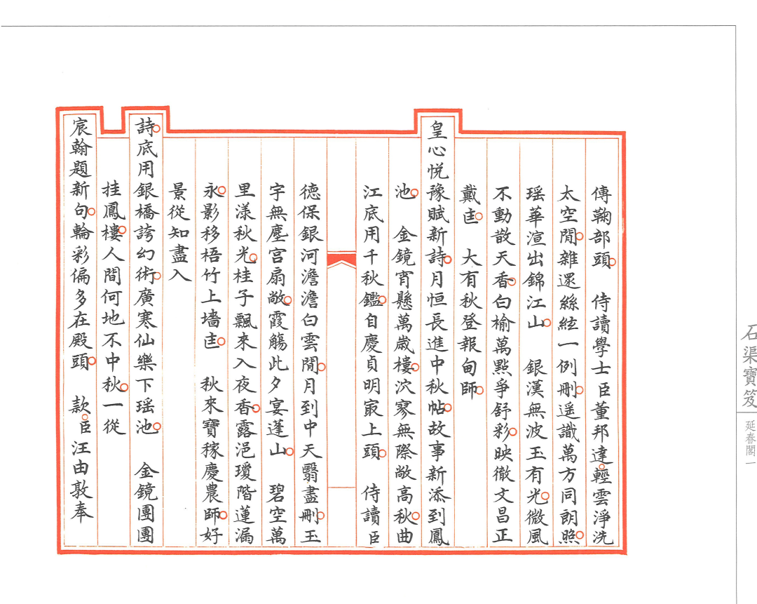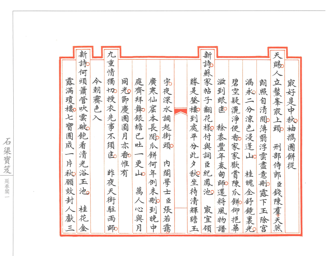 1)《石渠宝笈三编》,廷春阁藏一,〈高宗纯皇帝御笔中秋帖子词〉,见《秘殿珠林石渠宝笈汇编》,第九册,北京出版社,2003,页1015-1019