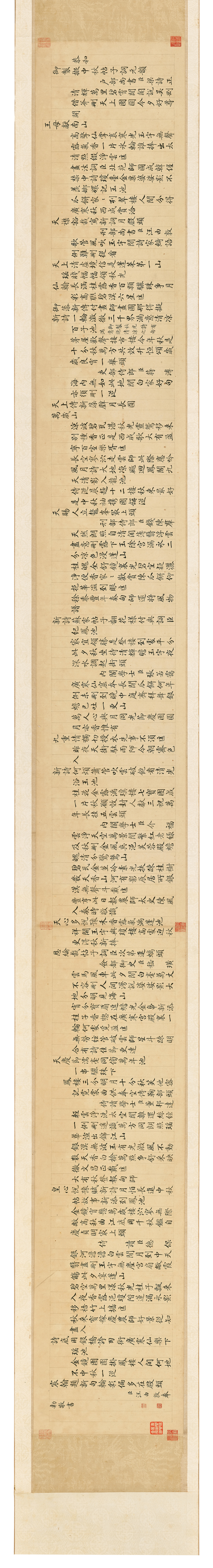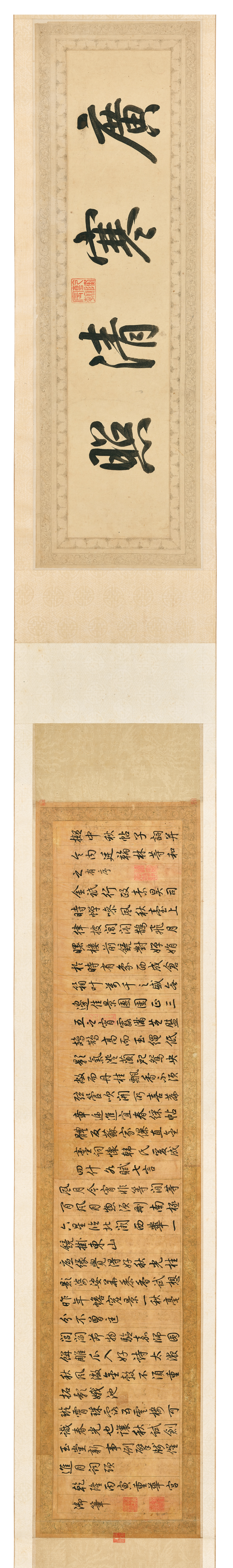 本拍品引首为乾隆御笔「广寒清照」四大字,书于清宫特制海波纹笺上,落落大方。紧接有乾隆在「倪仁禀□」藏经纸上书写《拟中秋帖子词有序》一篇,内容与王献之《中秋帖》后之题跋完全相同,卷后是内廷翰林恭和御制元韵九首。