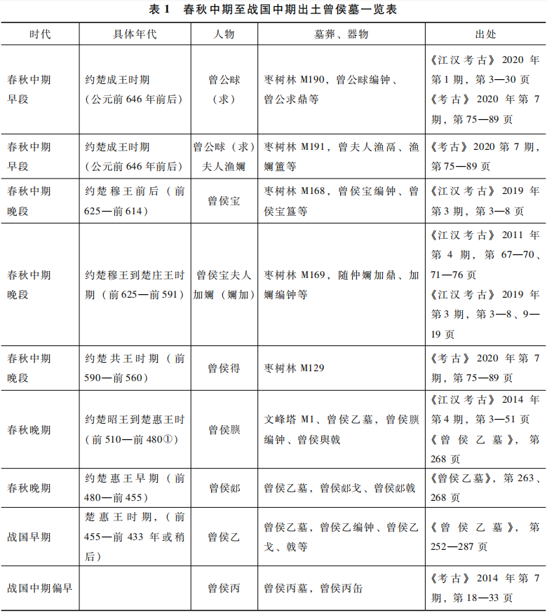 从1978年湖北随县(今随州市)擂鼓墩曾侯乙墓的发掘引起世人瞩目以来,近些年曾国考古有了飞跃式进展。随着叶家山、文峰塔、郭家庙、苏家垄、枣树林等曾国遗址与墓地的发掘,曾国从早期建国到战国中期灭亡的历史越来越清楚,过去文献中未曾见过的湖北曾国却成了考古学文化序列最为完整的诸侯方国,也被称为“中国南方周代青铜考古学文化研究的标尺”[43]。特别是随着枣树林曾国贵族墓地的发掘,春秋中期至战国中期曾侯在位的序列大致清晰可见(见表1)。
