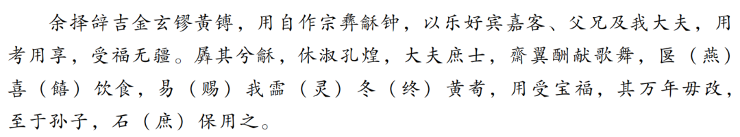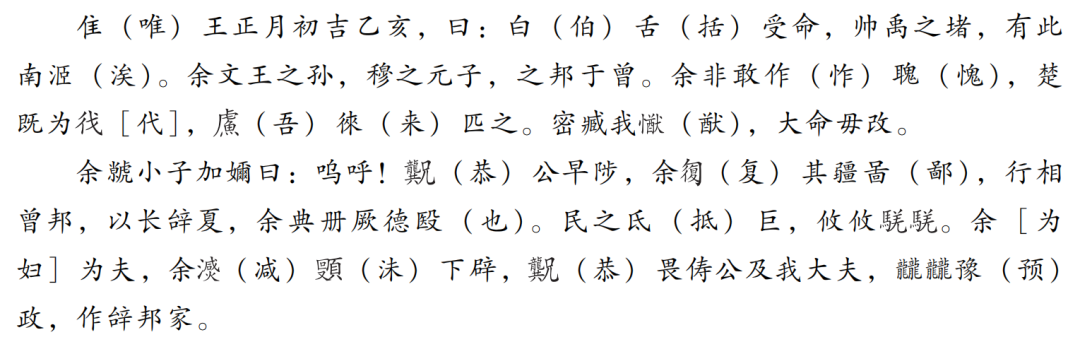 周室之既庳(卑),吾用燮謞(熇)楚。吴恃有众庶行乱,西政(征)南伐,乃加于楚。荆邦既凶,而天命将误。有严曾侯,业业厥圣,亲博武攻(功)。楚命是争(静),复奠(定)楚王……余申(固)楚城,改复曾疆。