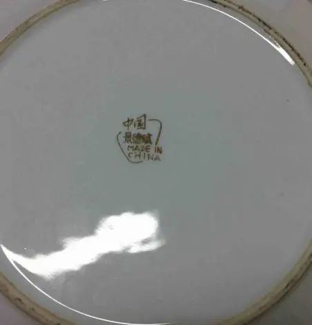 3 、启用新式“ 中国景德镇” 四行款,此前曾经短暂使用过“中国景德镇”三行款,后绝大多数瓷厂采用了四行款, 即:自上而下第一行等线体“中国景德镇”五个字,第二行英文“MADE IN”,第三行英文“CHINA”,第四行为左右各两道短横线,中间夹企业代号(字母或数字)。此种四行款一直使用到90年代上半叶。