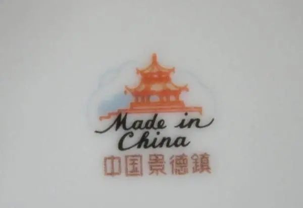 1 、印花龙珠阁款。底款为红色龙珠阁图案, 背景为淡石绿色。中为黑色英文“MADE IN CHINA”,下为一排褐色“中国景德镇”字样。关注公众号:老货圈。此款多在印花出口瓷器中使用,且有大小不同多种规格。