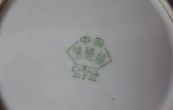 3 、印线六边形款。底款外形呈不规则六边形, 上为“ 中国”两字,中为“景德镇”,下为英文“CHAIN”和两短线夹瓷厂代号字母。底款文字与字母间用线条相隔连。此款主要有红彩、绿彩、蓝彩三种颜色,也有极少用金彩的。此款多使用于手绘或者半手绘的内销瓷器上。