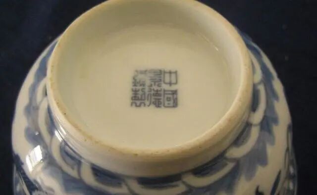 4、启用新式“中国”中英文款。文革后期随着外贸形势的变化和各厂生产状况的差异,部分瓷厂开始启用新式青花底款:自上而下第一行等线体“中国”两字,第二行英文“MADE IN”,第三行英文“CHINA”。此种青花款以70年代后期人民瓷厂的青花产品居多。到1985年前后,此款又被新式“人民瓷厂 景德镇”和“光明瓷厂 景德镇”款所代替。