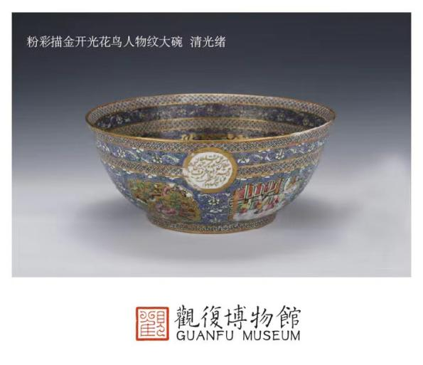 清光绪 粉彩描金开光花鸟人物纹大碗