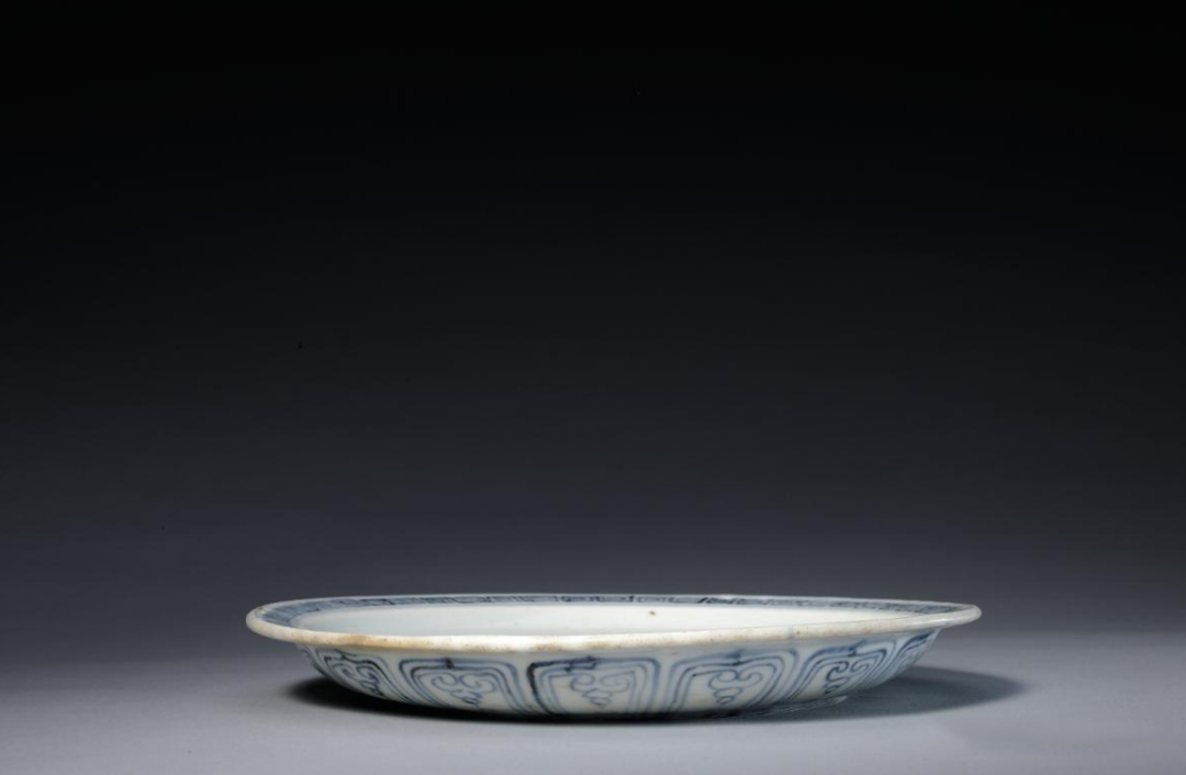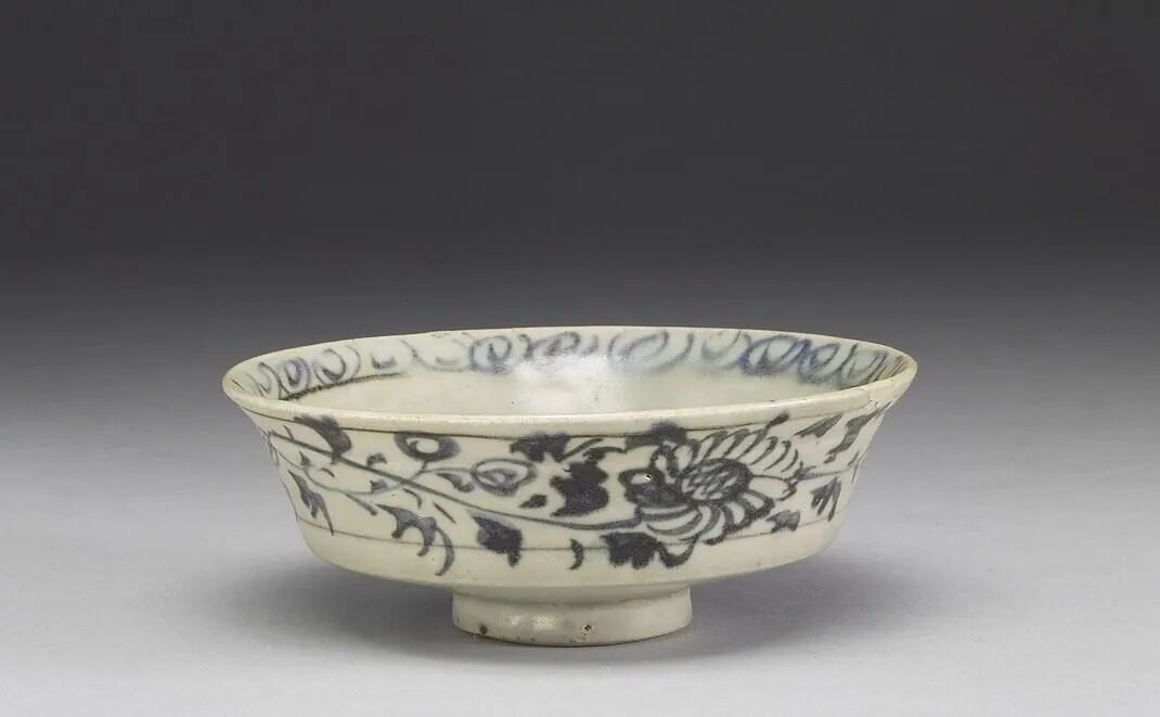 折腰碗,侈口、斜壁、折腰、小圈足,足缘及足裡无釉,足心有轮製痕及尖脐状突起,足缘切削平整,造形与元代景德镇枢府窑相类,属元末景德镇作品。其器裡亦印花为饰,齿状卷草纹整齐蟠绕,只是再增以青花绘饰。口缘快笔绘圈状回纹一周,内心书一行草「寿」字;外壁上下各勒一弦纹,其间绘青花转枝菊花纹;所罩釉与卵白色相近而泛青灰,青花发色青黑,浓处现铁鏽斑。