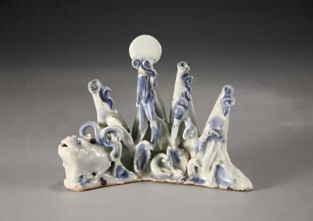 笔架由四座耸入云间的海礁组成,顶端有一轮明月;笔架的左面为鱼蛙形水盂,背上有小孔。全器施青白釉,用青花描绘云朵、波浪、鱼蛙的双眼及部分海礁。构图层析复杂,但处理得当,总体看来给人以素雅宁静之感。